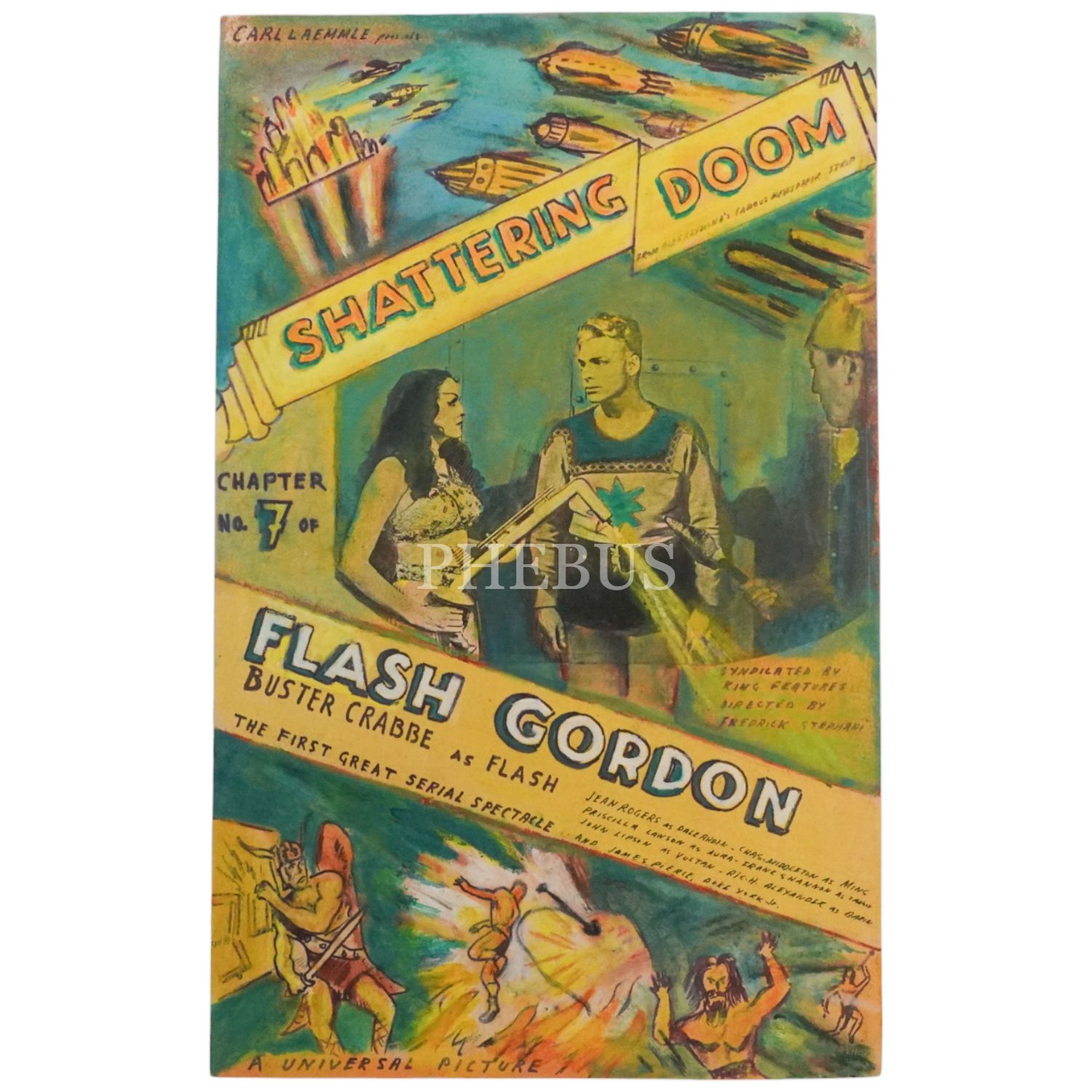 1936 yılında sahneye konulan "FLASH GORDON - SHATTERING DOOM" filmi için guaj boya ve kolaj tekniğiyle hazırlanmış orijinal el çizimi afiş, 27x45 cm...