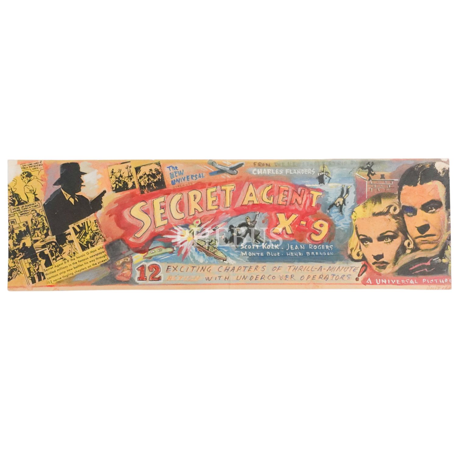 Flash Gordon´un da çizeri olan Alex Raymond´ın yarattığı "Secret Agent X-9" çizgi romanının sinema uyarlaması için kolaj tekniği ve guaj boyayla hazırlanmış orijinal el çizimi afişi, 41x12 cm...