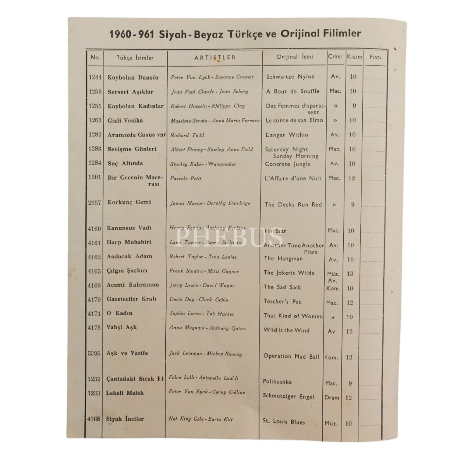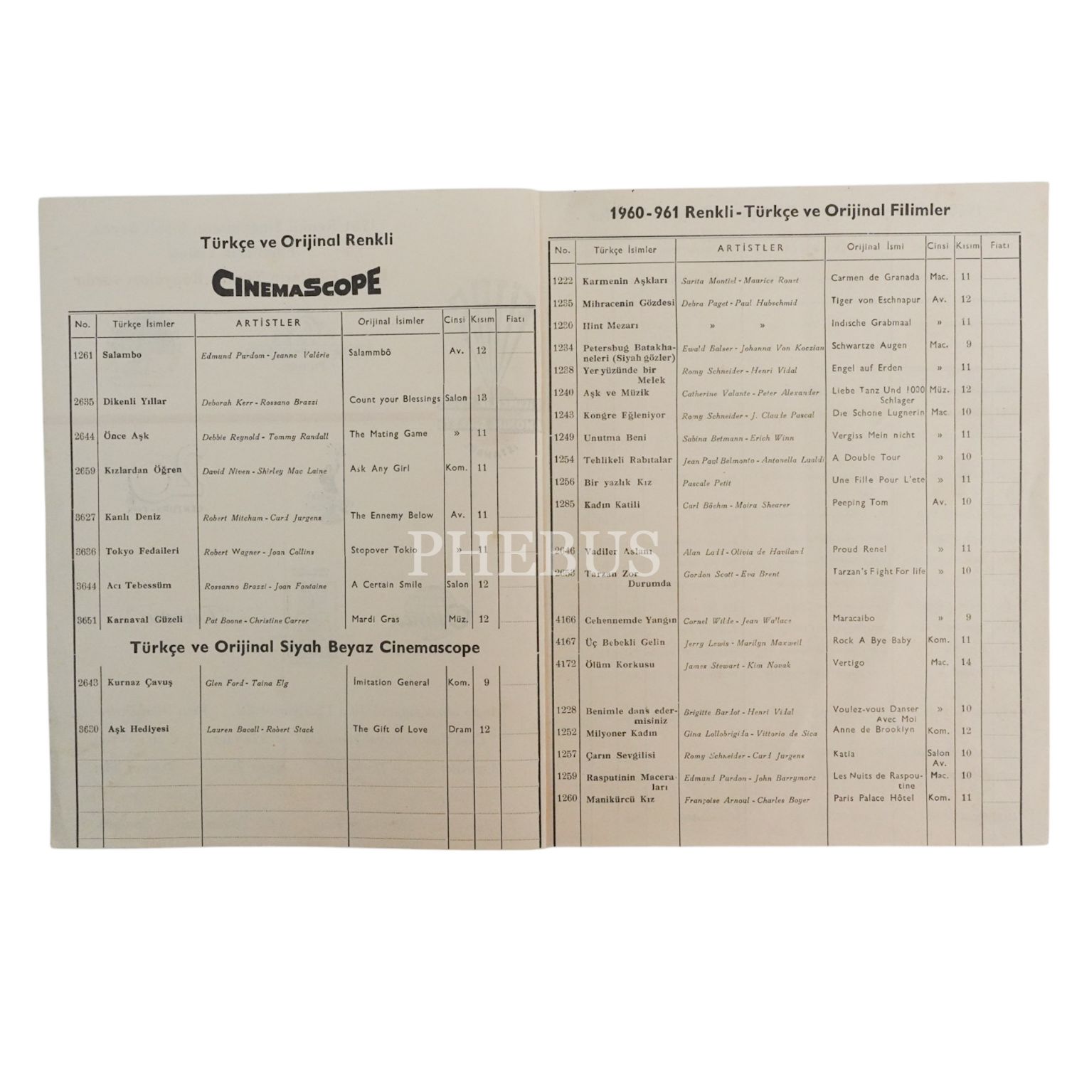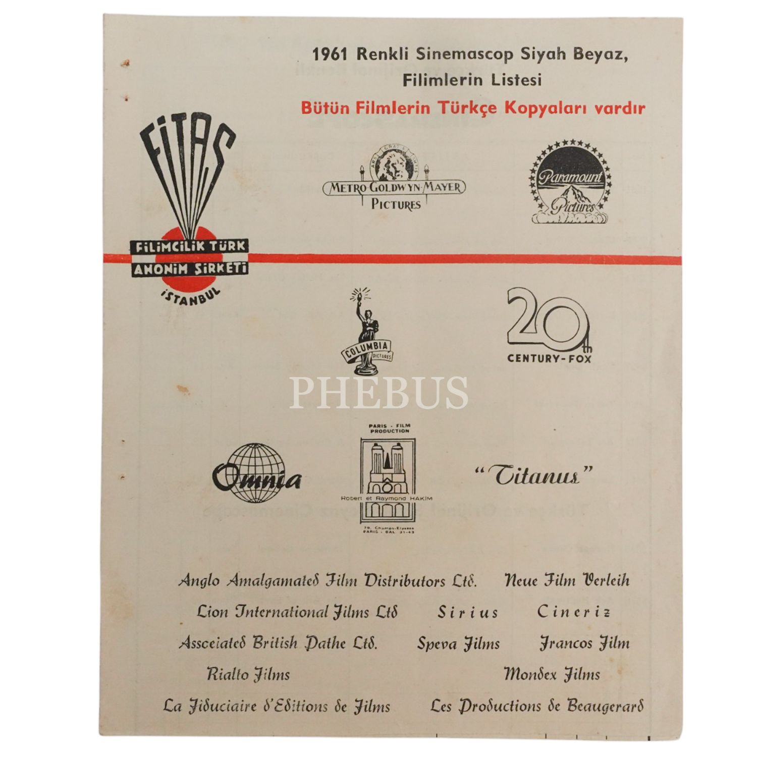 Fitaş Filmcilik Türk Anonim Şirketi, 1961 tarihli renkli sinemascop siyah beyaz filmlerin broşürü, 20x24 cm...