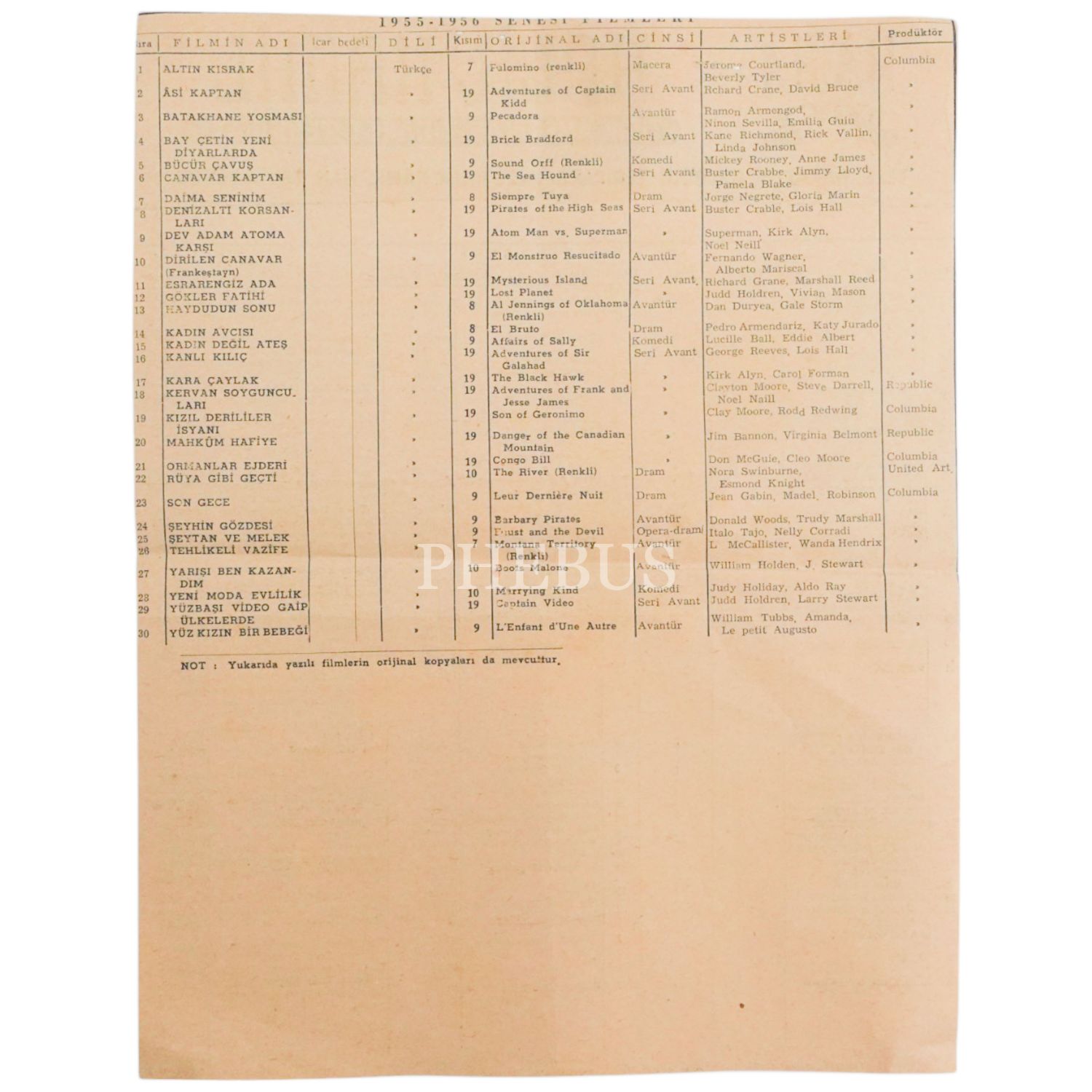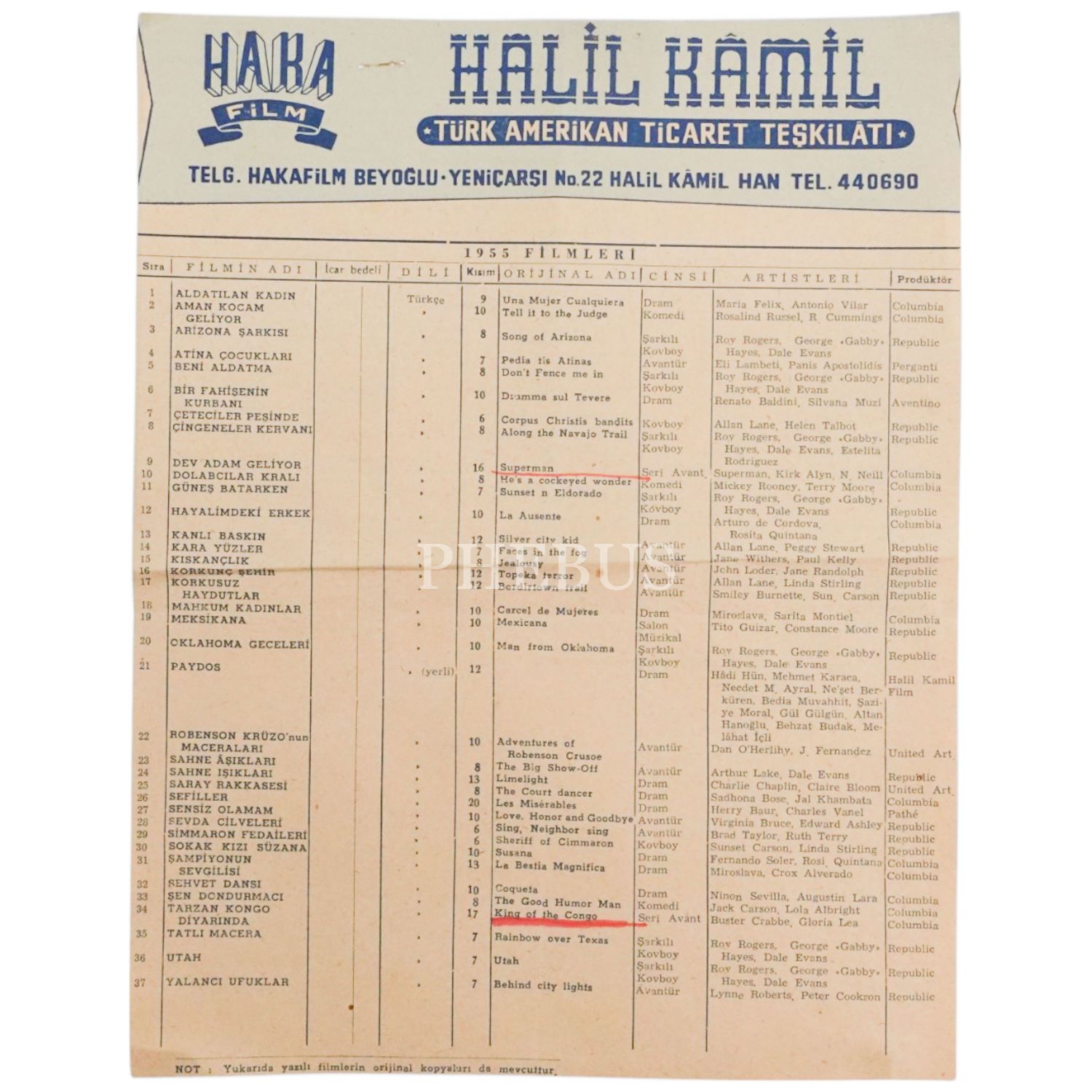 (Halil Kamil) Haka Filmcilik´e ait, 1955 yılının prodüksiyon listesi, 22x30 cm...