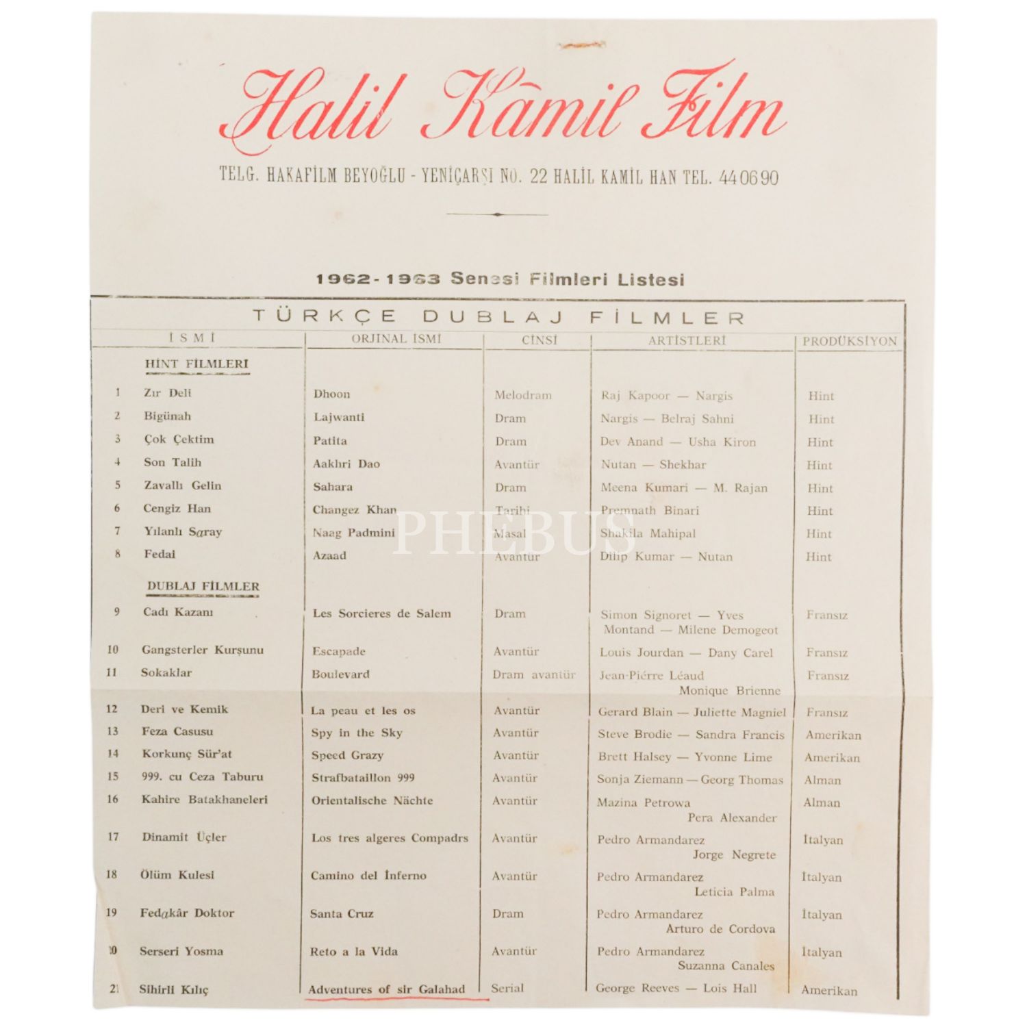 (Halil Kamil) Haka Filmcilik´e ait, 1962-63 yıllarının prodüksiyon listesi, 22x30 cm...