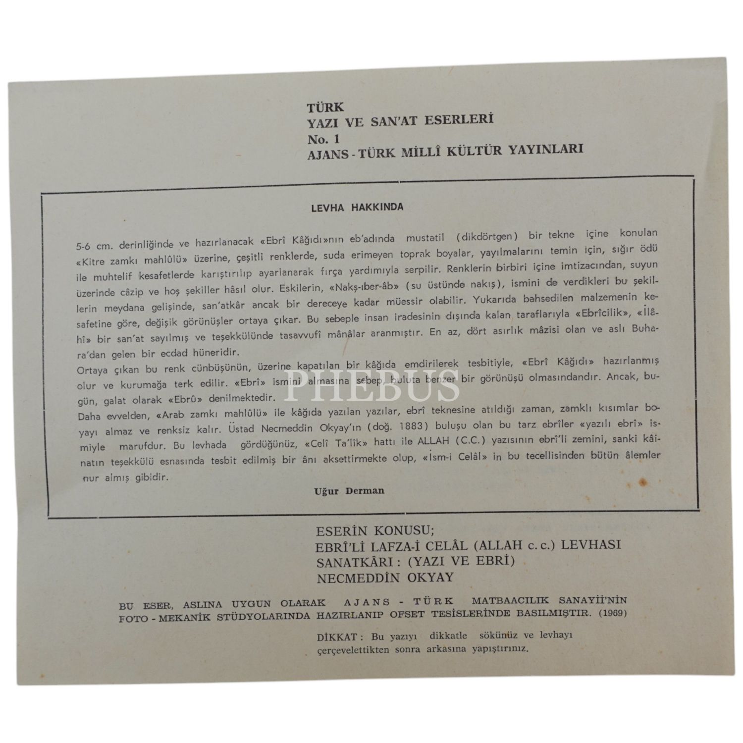 Necmettin Okyay´ın celi talik "Allah" yazılı akkase ebrusunun 1969 senesinde yapılmış baskısı, 21x32 cm...