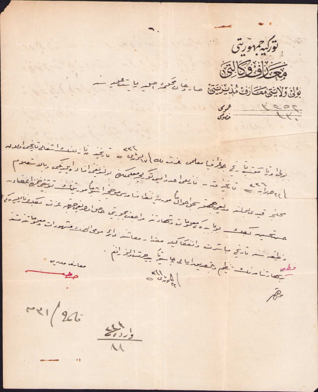 Osmanlıca Türkiye Cumhuriyeti Maarif Vekaleti Bolu Vilayeti Müdürü antetli Bolu orta mektebinde coğrafya muallimi olan İzzet Beyin daha önce türkçe muallimliğe yaptığına dair 1341 tarihli belge, 15x18 cm