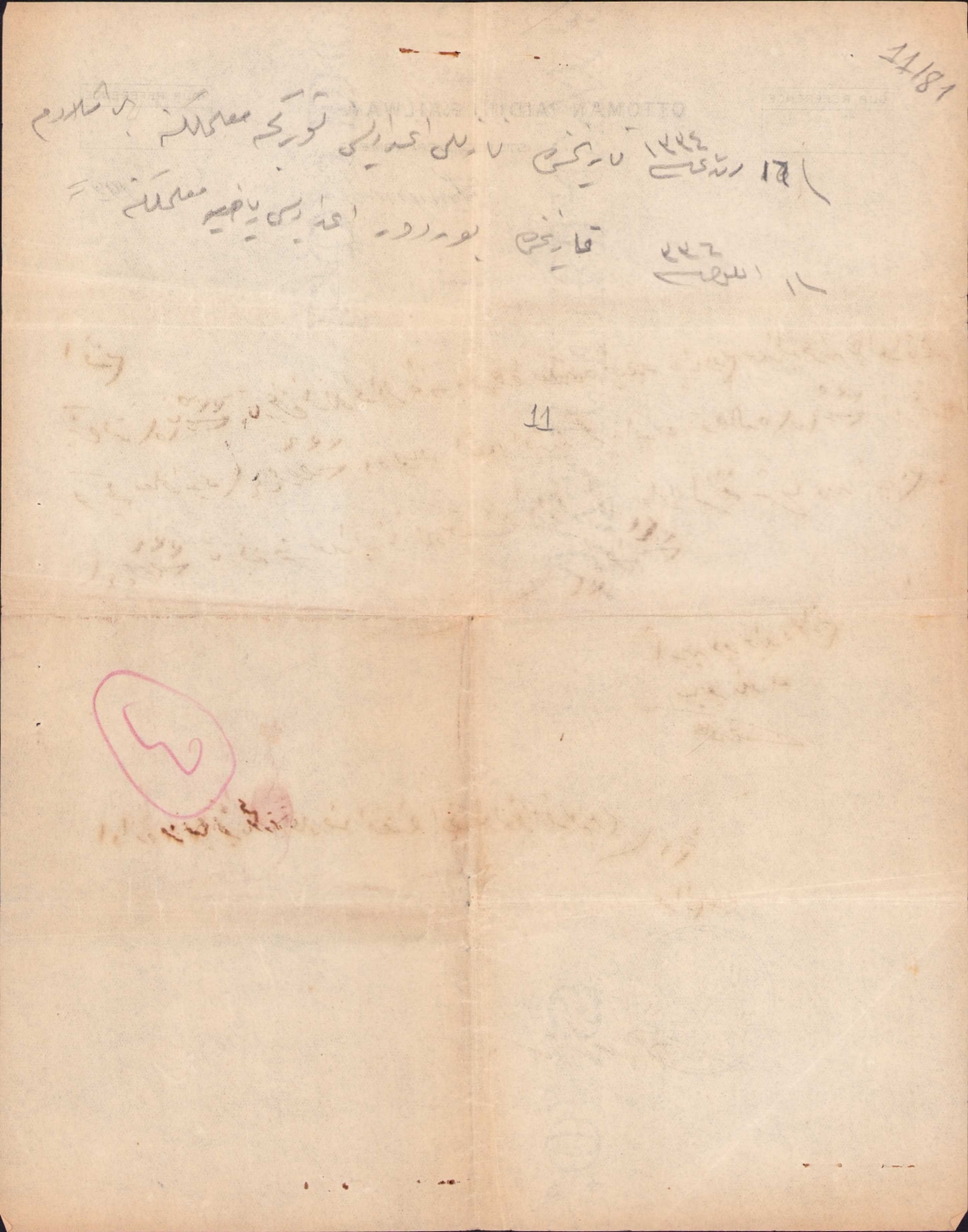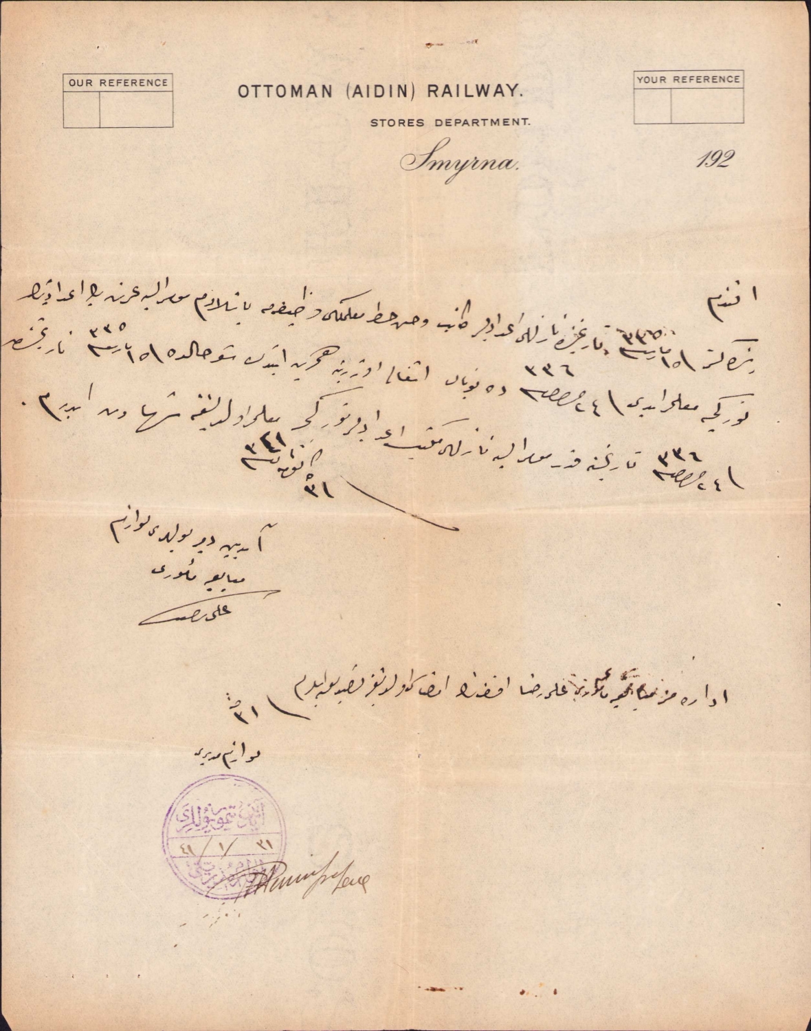 Osmanlı İzmir Aydın Demiryolu antetli doküman, 1336 tarihli, Osmanlıca hat muallimi ile alakalı evrak, Osmanlıca Aydın Demiryolu damgalı, 20x28 cm