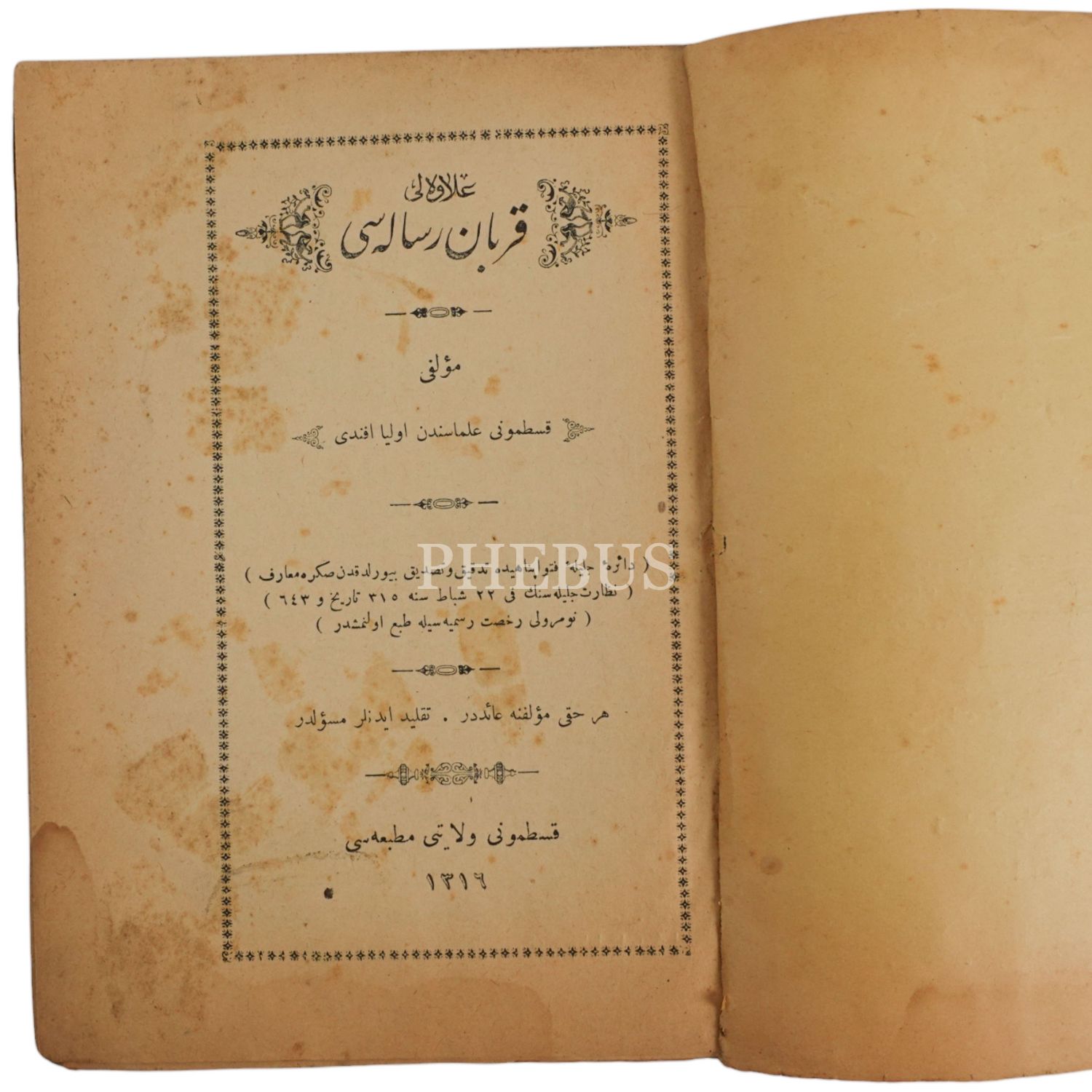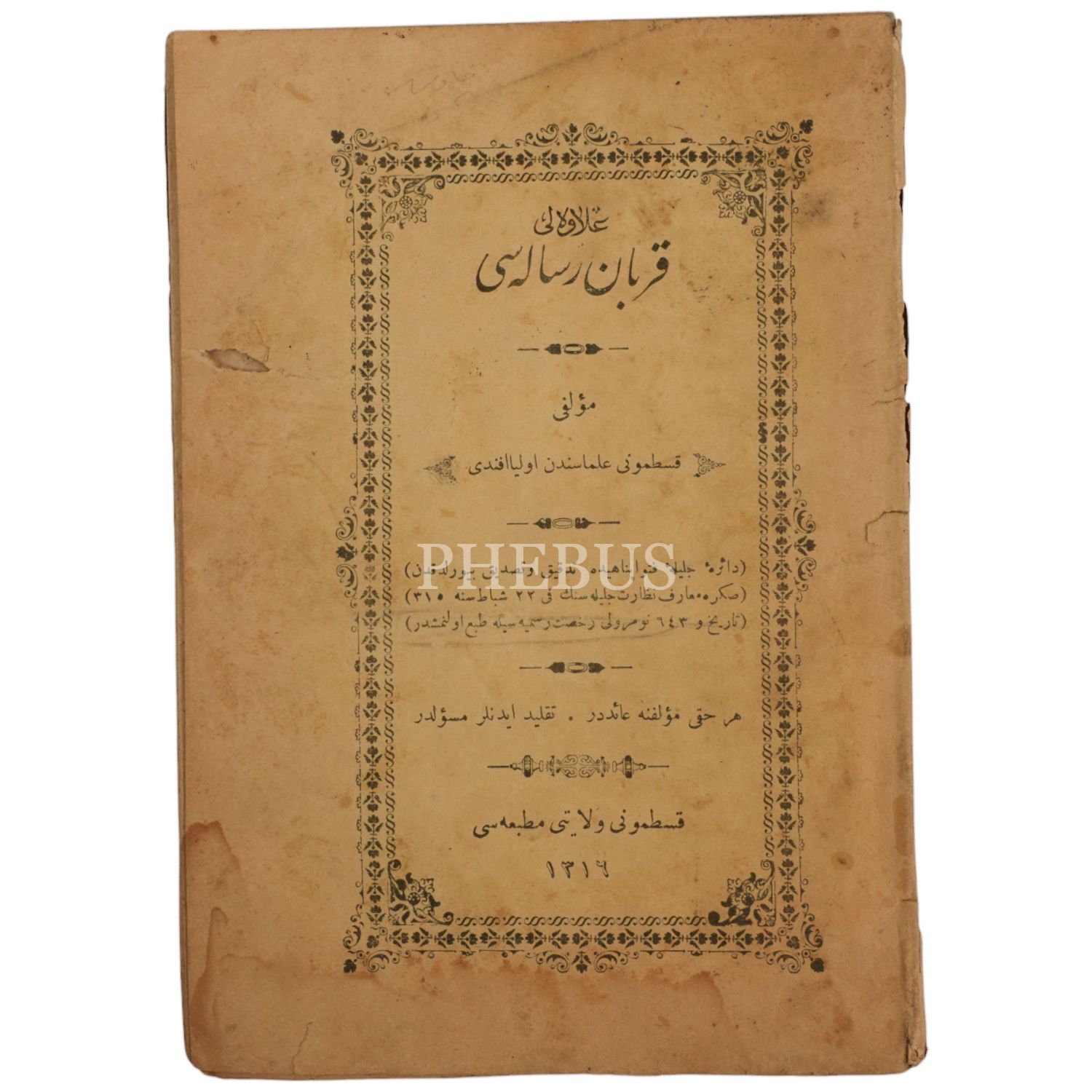 İLAVELİ KURBAN RİSALESİ, Kastamonu ulemasından Evliya Efendi, Kastamonu Vilayeti Matbaası, 1316, 67 sayfa, 21x15 cm...