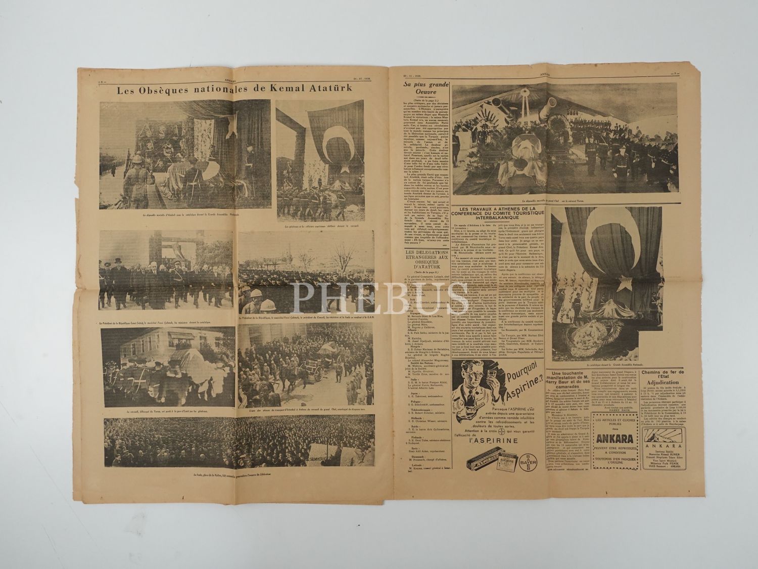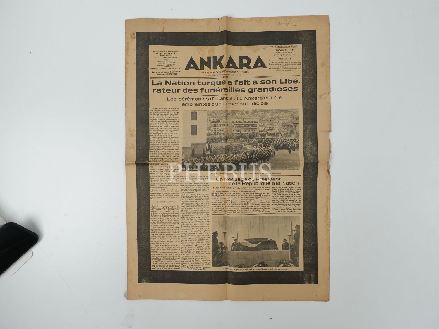 "La Nation turque a fait a son Libérateur des funerailles grandioses" manşetiyle, Mustafa Kemal Atatürk´ün naaşını Ankara Etnografya Müzesi´ne defnini konu alan 24 Kasım 1938 tarihli Fransızca ANKARA gazetesi, 44x60 cm...