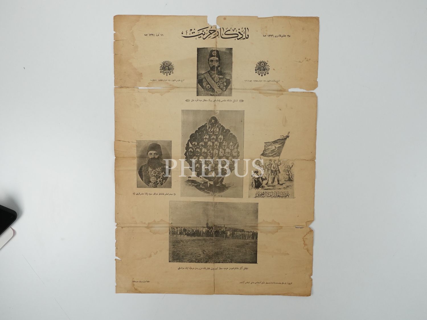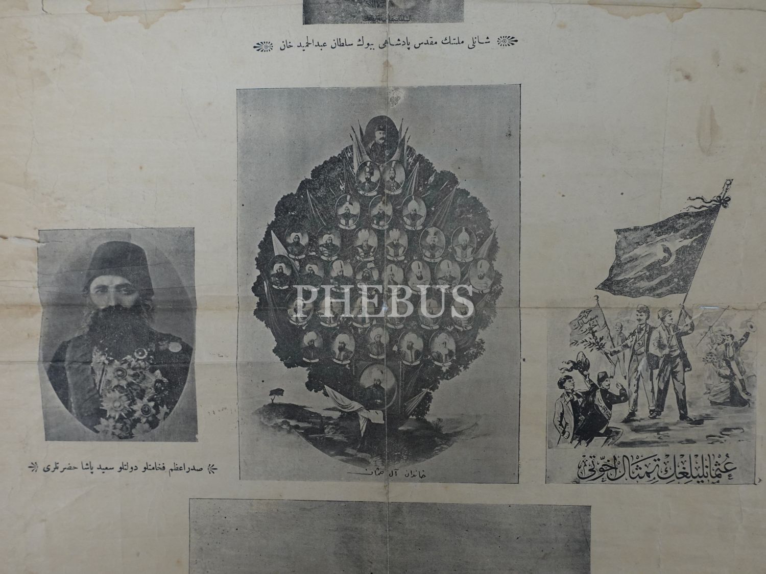 "Yadigar-ı Hürriyet" başlıklı, Sultan İkinci Abdülhamid, Sadrazam Sait Paşa, Osmanlı padişahları görselli Meşrutiyet temalı afiş, 41x56 cm...