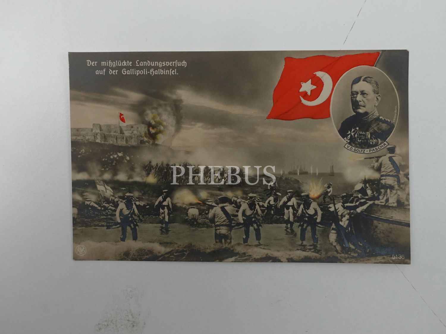 Osmanlı Ordusu mareşallerinden Goltz (Golç) Paşa´nın portresine ve Çanakkale´de çıkarma yapan düşman askerlerine hücum eden Türk askerlerinin tasvirine yer verilen, Birinci Cihan Harbi temalı kartpostal, 14x9 cm...