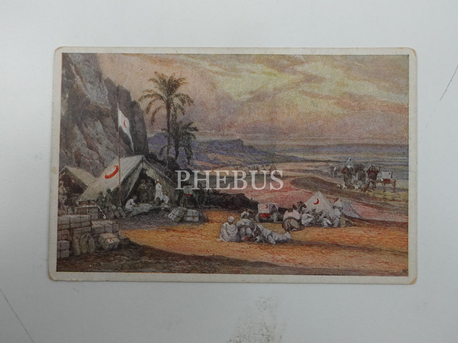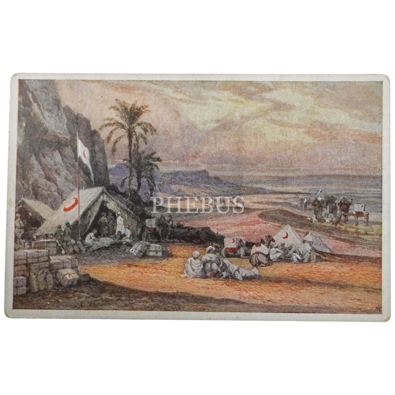 Birinci Cihan Harbi esnasında cephe gerisine kurulmuş Hilal-i Ahmer çadırlarının resmedildiği kartpostal, ed. Hilal-i Ahmer Cemiyeti, 14x9 cm...