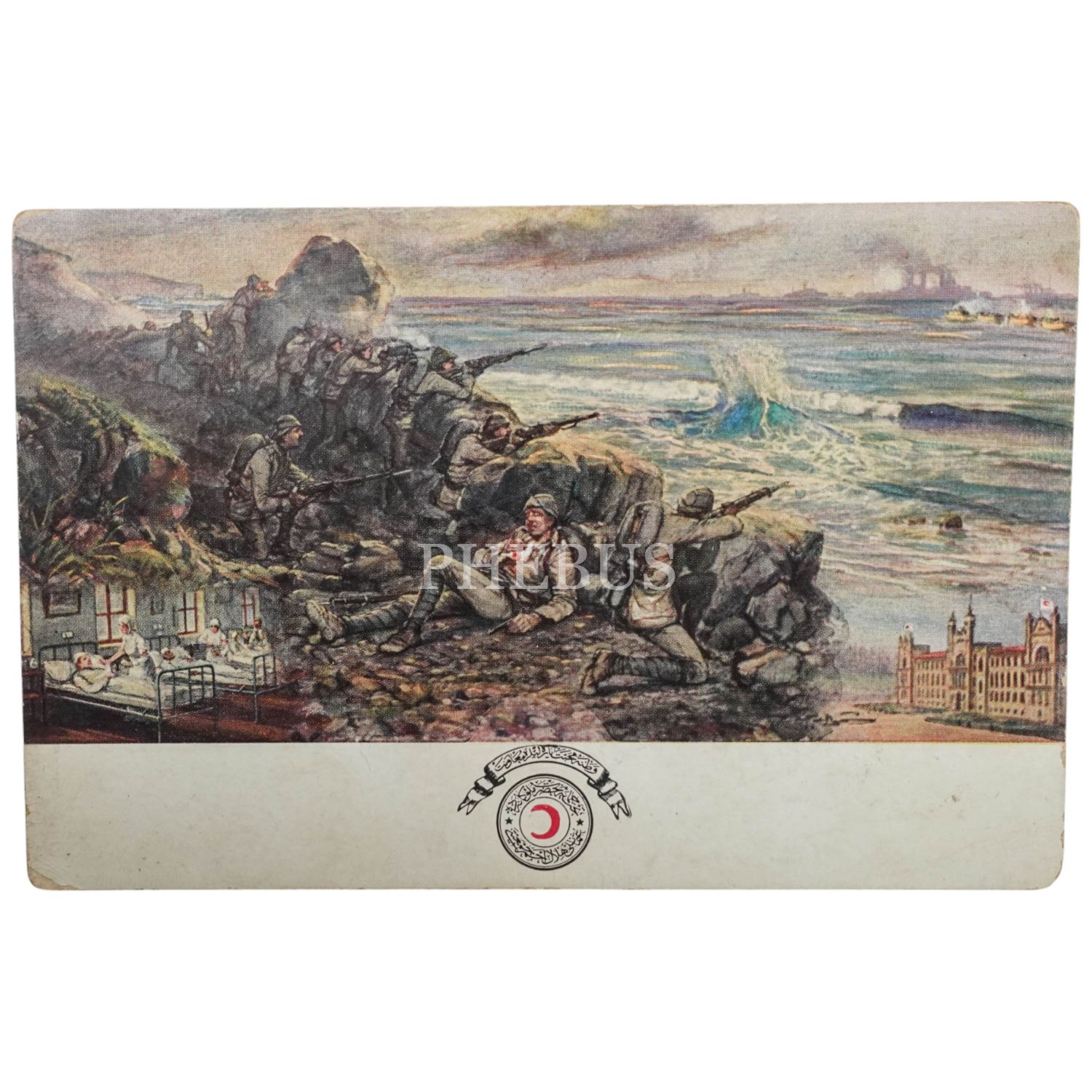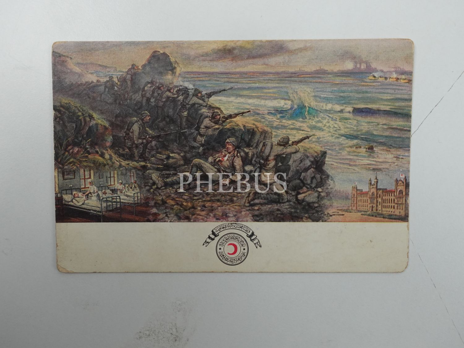 Cephede yaralanmış bir Türk askeri, Haydarpaşa Askeri Hastahanesi ve bu hastanenin içinde tedavi gören askerler görselli parçalı kartpostal, ed. Hilal-i Ahmer Cemiyeti, 14x9 cm...