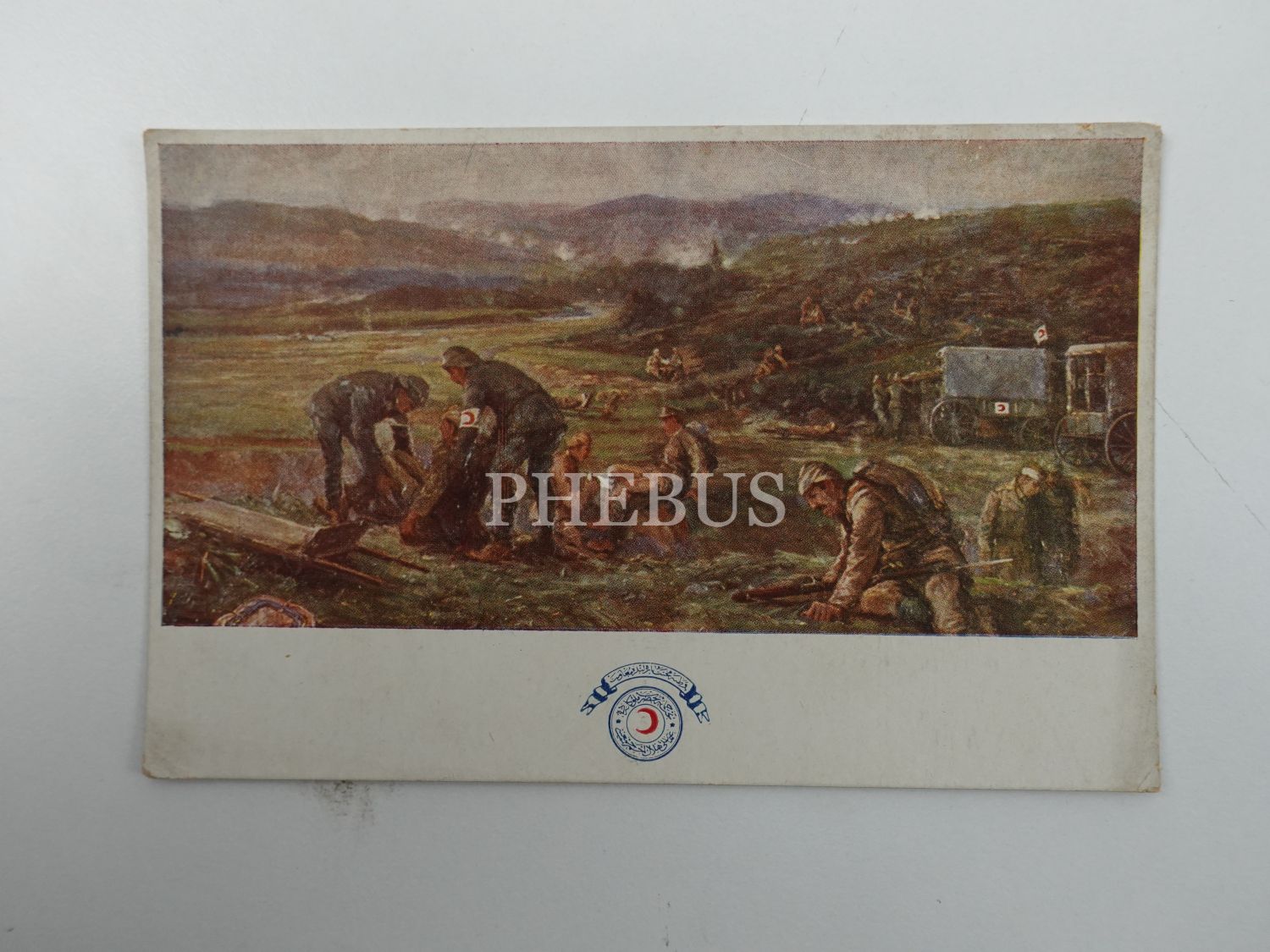Hilal-i Ahmer bazubentli sıhhiyecinin desteğiyle tedavi olmaya giden yaralı bir Türk askerleri, ed. Hilal-i Ahmer Cemiyeti, 14x9 cm...