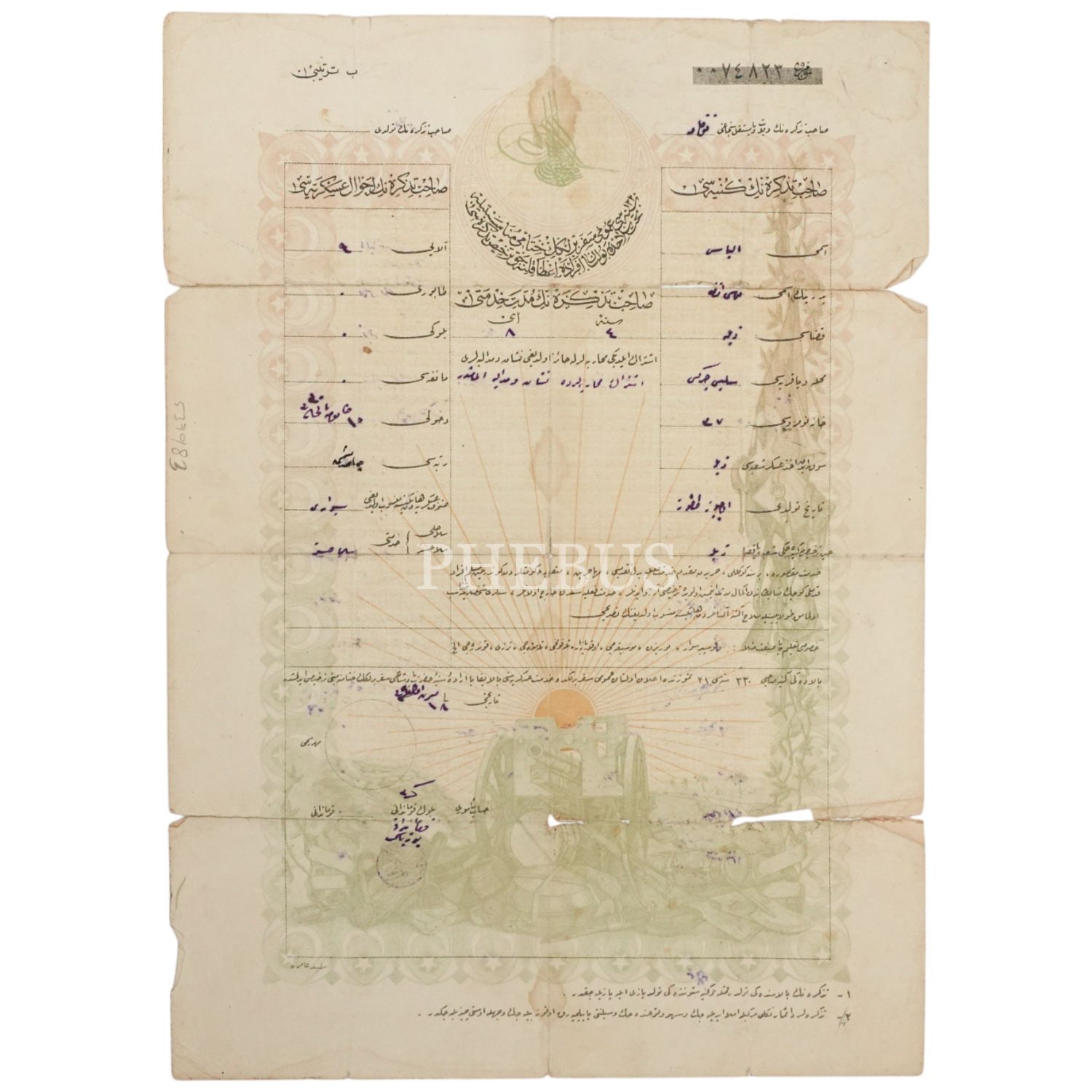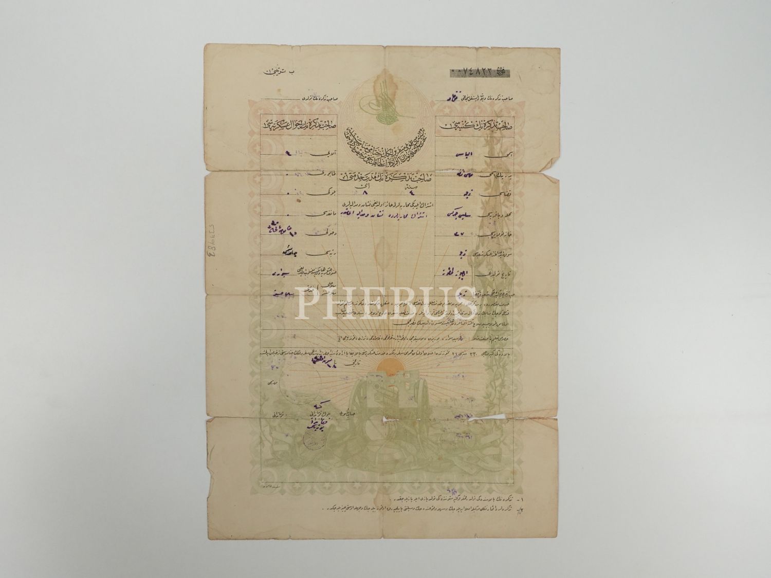 Birinci Cihan Harbi´nde ilan edilen seferberliğe iştirak ederek Osmanlı ordusuna katılmış Tokatlı İlyas Efendi´nin seferberlik görevinin bittiğine dair verilmiş tezkere, 24x34 cm...