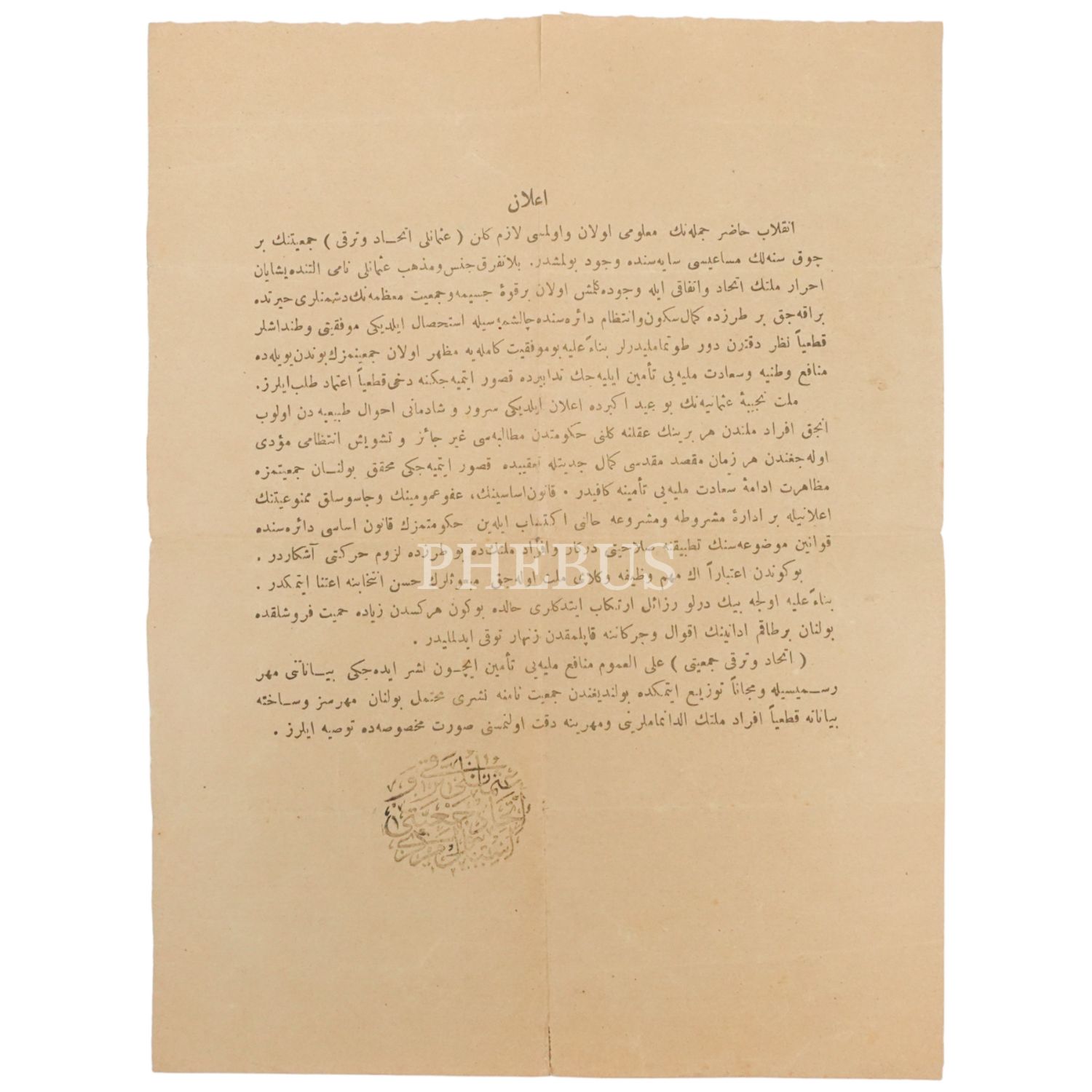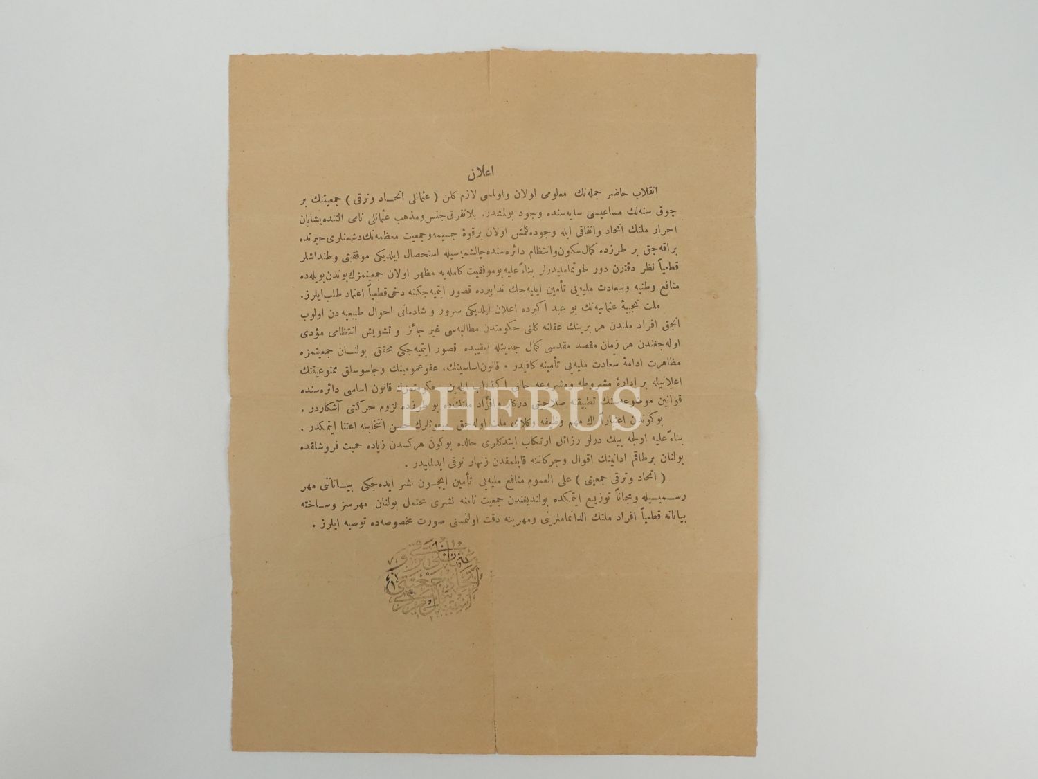 Osmanlı İttihat ve Terakki Cemiyeti tarafından yayımlanan ve cemiyetin adı kullanılarak neşredilen asılsız haberlere itibar edilmemesi yönünde bir ihtar içeren "Beyanname" başlıklı yazı, 19x25 cm...