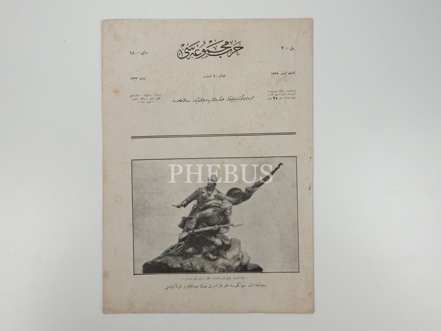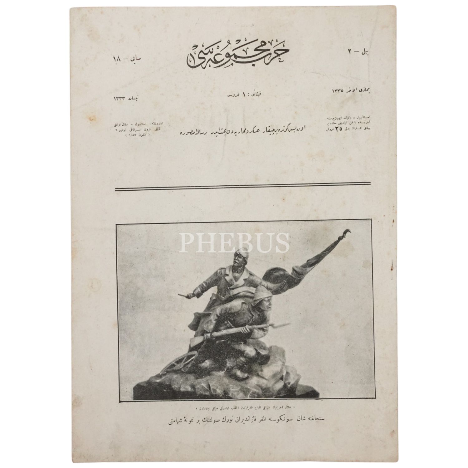 "Sancağına şan süngüsüne zafer kazandıran Türk silüetinin bir numune-i şehameti" başlıklı, HARB MECMUASI´nın Cemaziyelahir 1335 tarihli 18. sayısı, 25x35 cm...