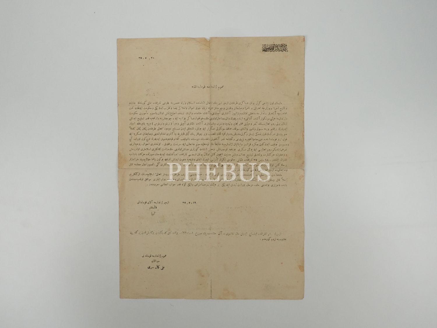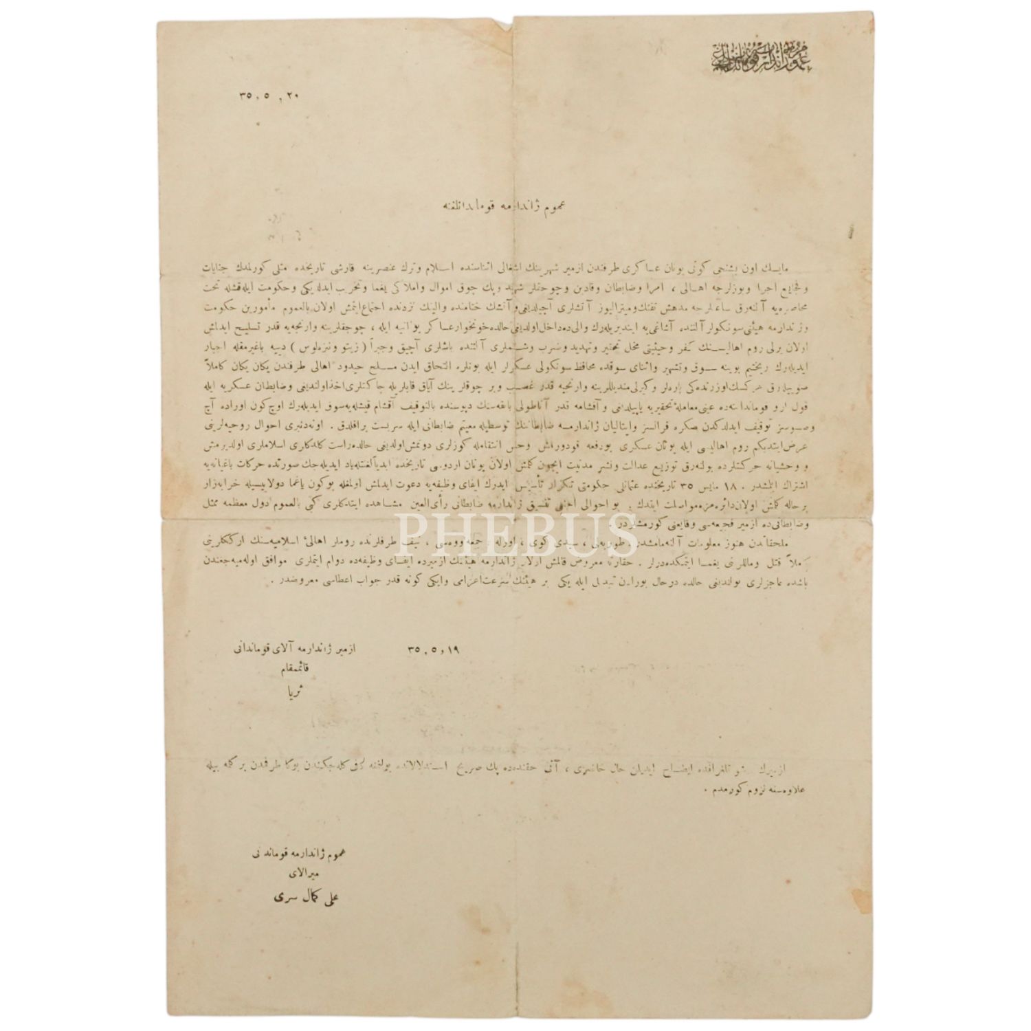 İzmir´de işgalci Yunan ordusu ve Rum ahalisinin Türk ahalisine yaptıkları zalimliklerden, Jandarma Komutanı´nın esir alınmasından ve Jandarma Dairesi´nin zapt edildiğinden bahsederek Jandarma efradının bu bölgeden çekilmek zorunda kaldığının dile getirildiği Umum Jandarma Kumandanlığı antetli evrak, 25x35 cm...