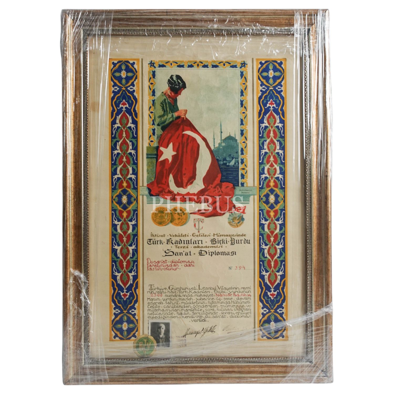 İhap Hulusi tasarımı Türk Kadınları Biçki Yurdu Terzi Akademisi Sanat diploması, çerçevesiyle birlikte 43x60 cm...