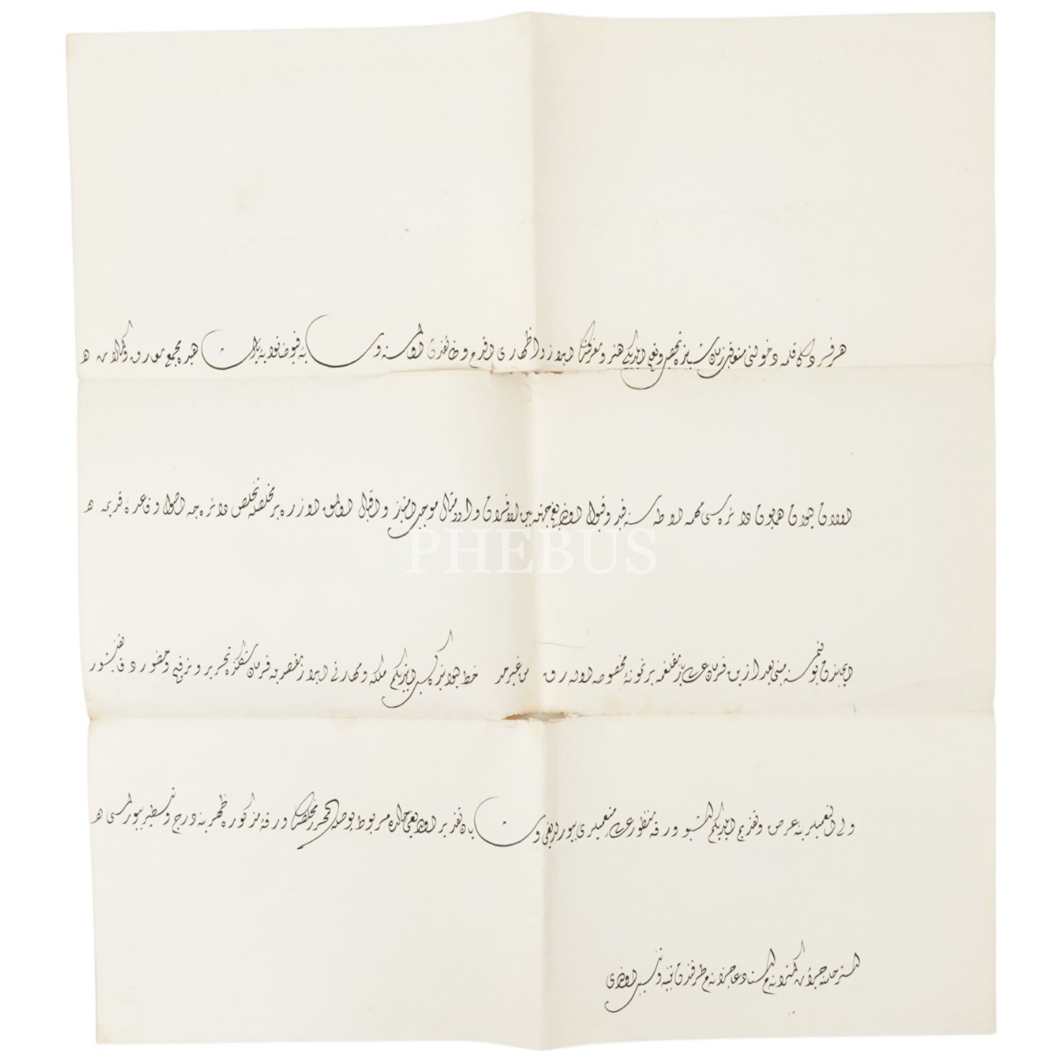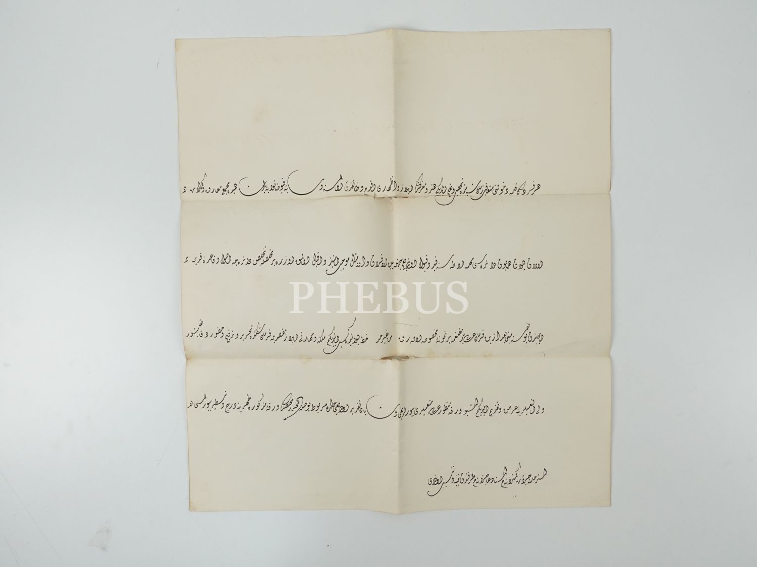 Divan-ı Hümayun Dairesi´ne katip olarak kabul edilen bir kişinin, kendisine bu işi almasında yardımcı olan büyüğüne ferman formunda, divani yazıyla kaleme aldığı teşekkür mektubu, 56x63 cm...