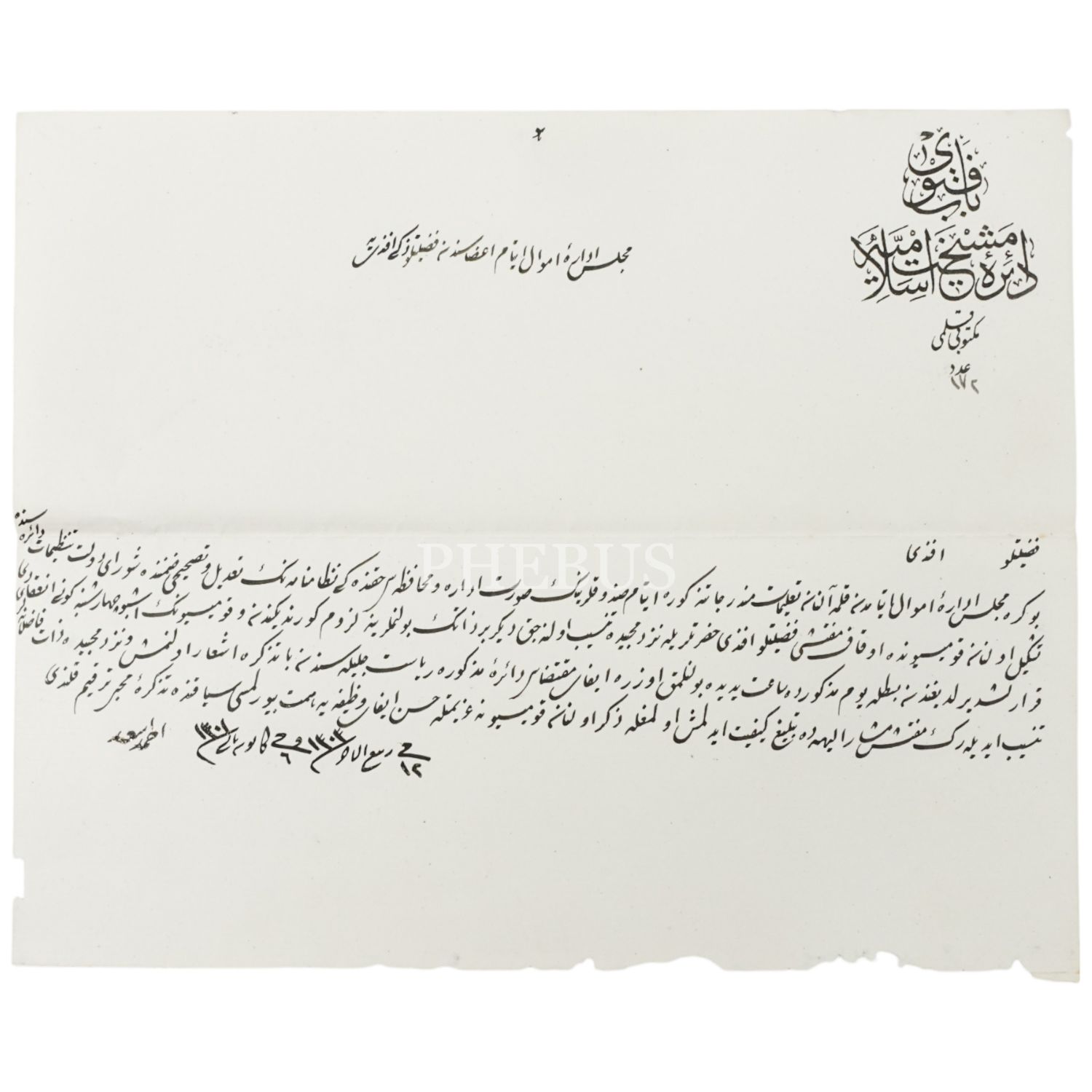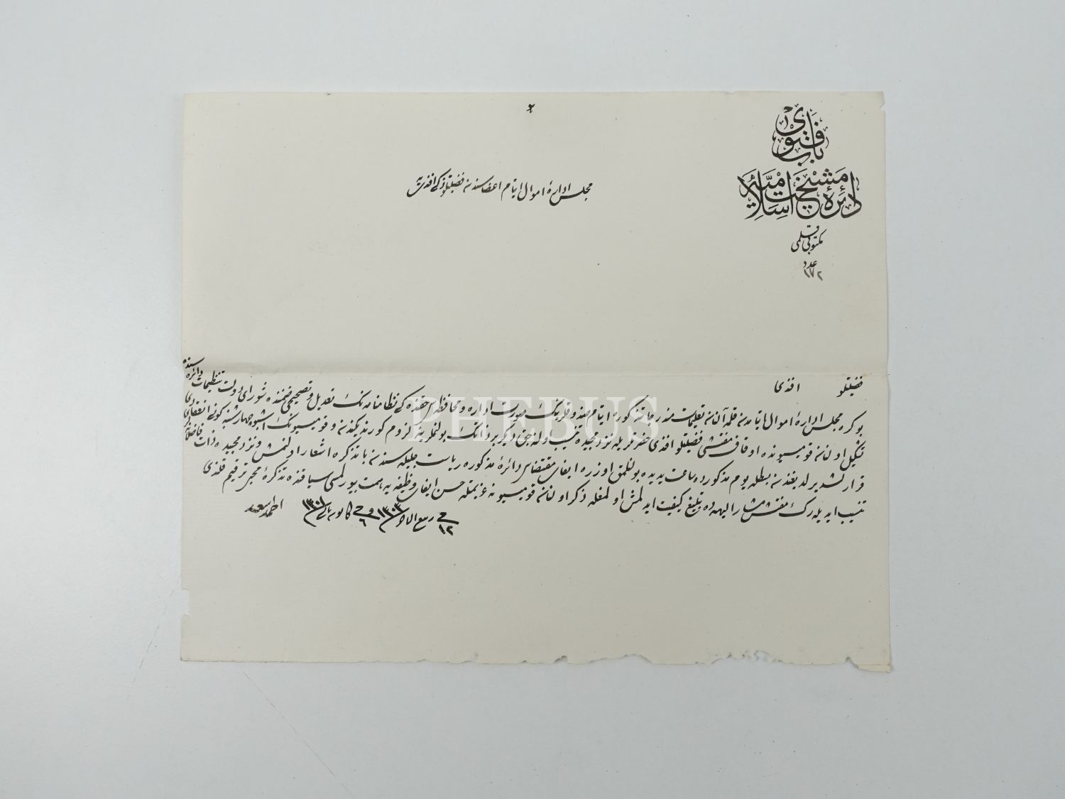 Meclis-i İdare-i Emval-i Eytam azasından Zeki Efendi´nin Eytam sandıklarının muhafazası için oluşturulan komisyonda yer alması gerektiğini bildiren "Bab-ı Fetva-yı Daire-i Meşihat-ı İslamiye" antetli, Şeyhülislam Ahmed Esad Efendi´nin imzasını taşıyan evrak, 1301, 24x19 cm...