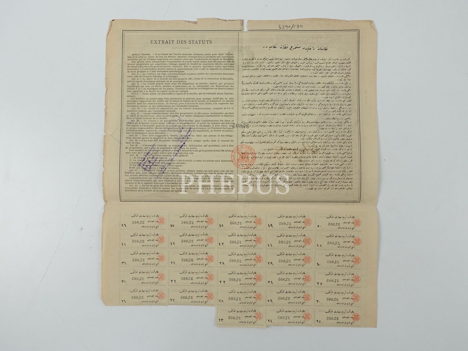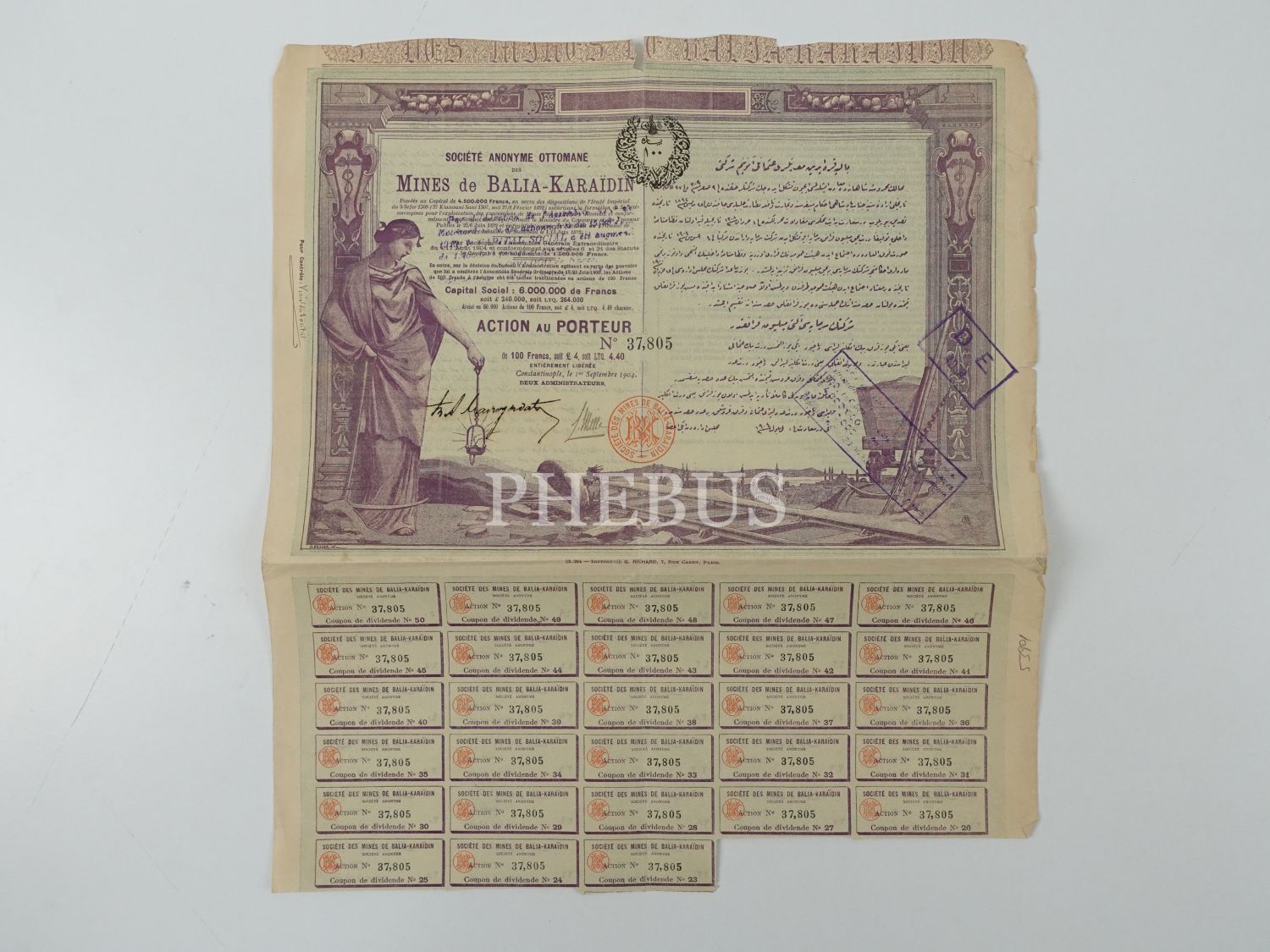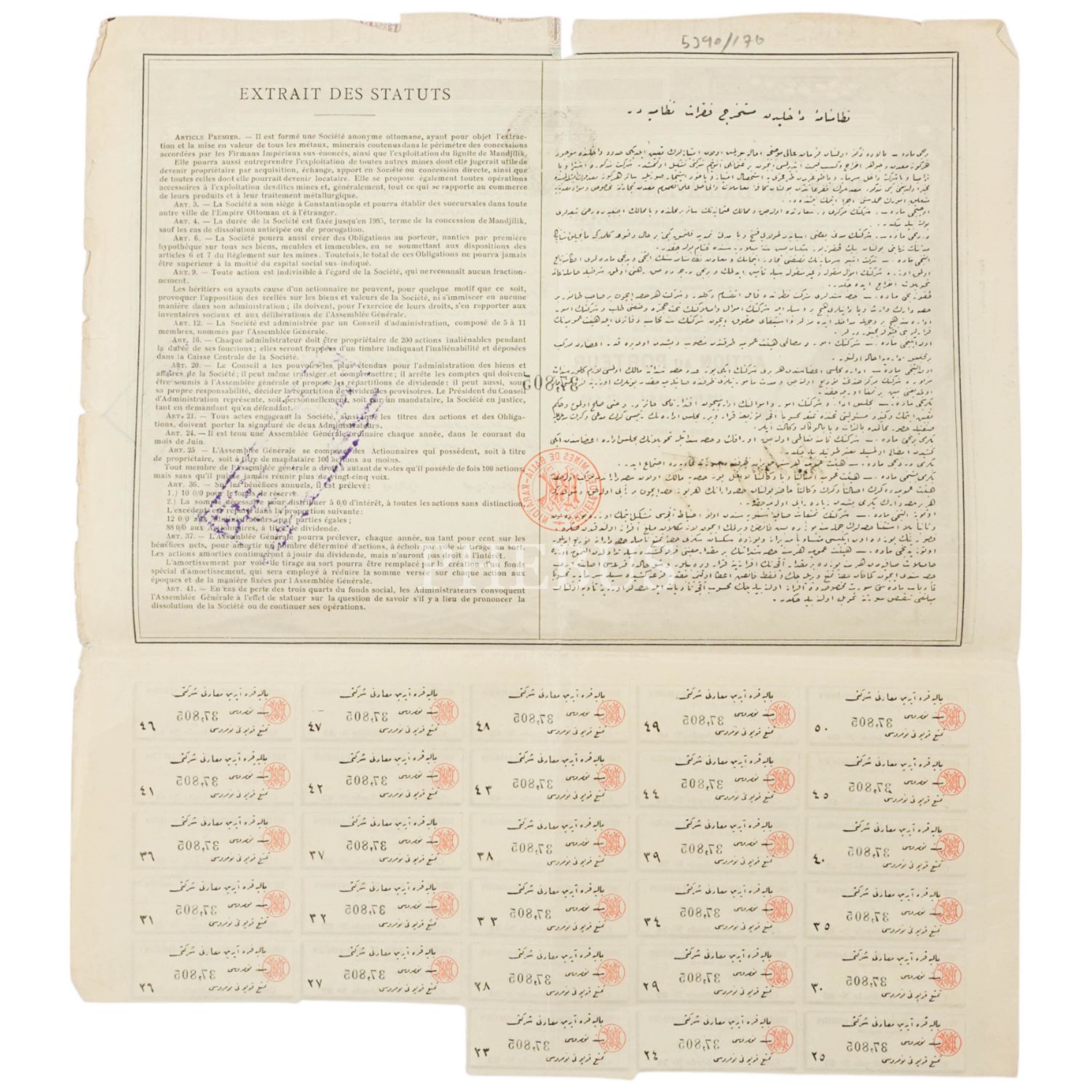Balya-Karaaydın Madenleri Osmanlı Anonim Şirketi´nin Osmanlıca ve Fransızca hisse senedi, 33x37 cm...