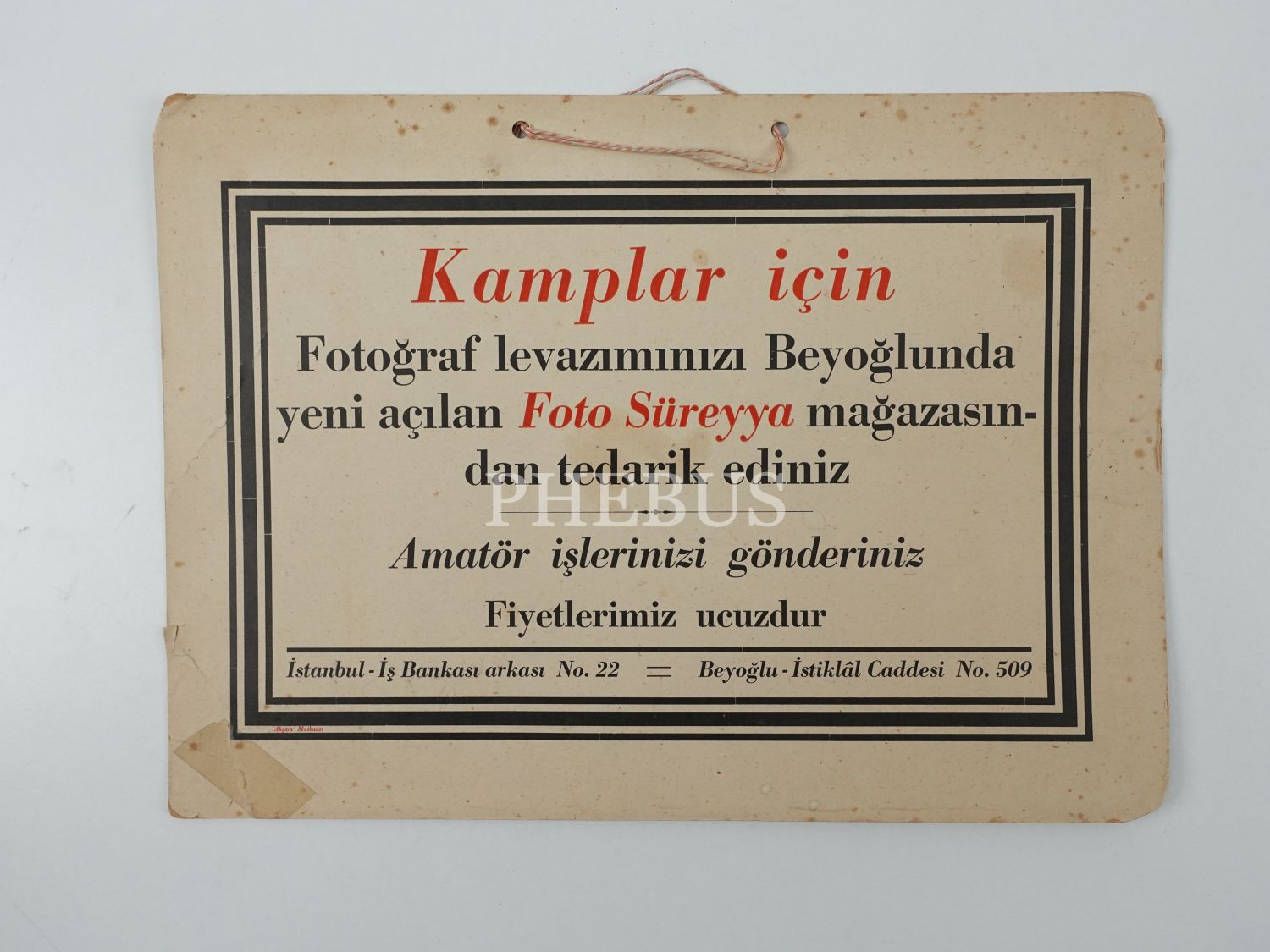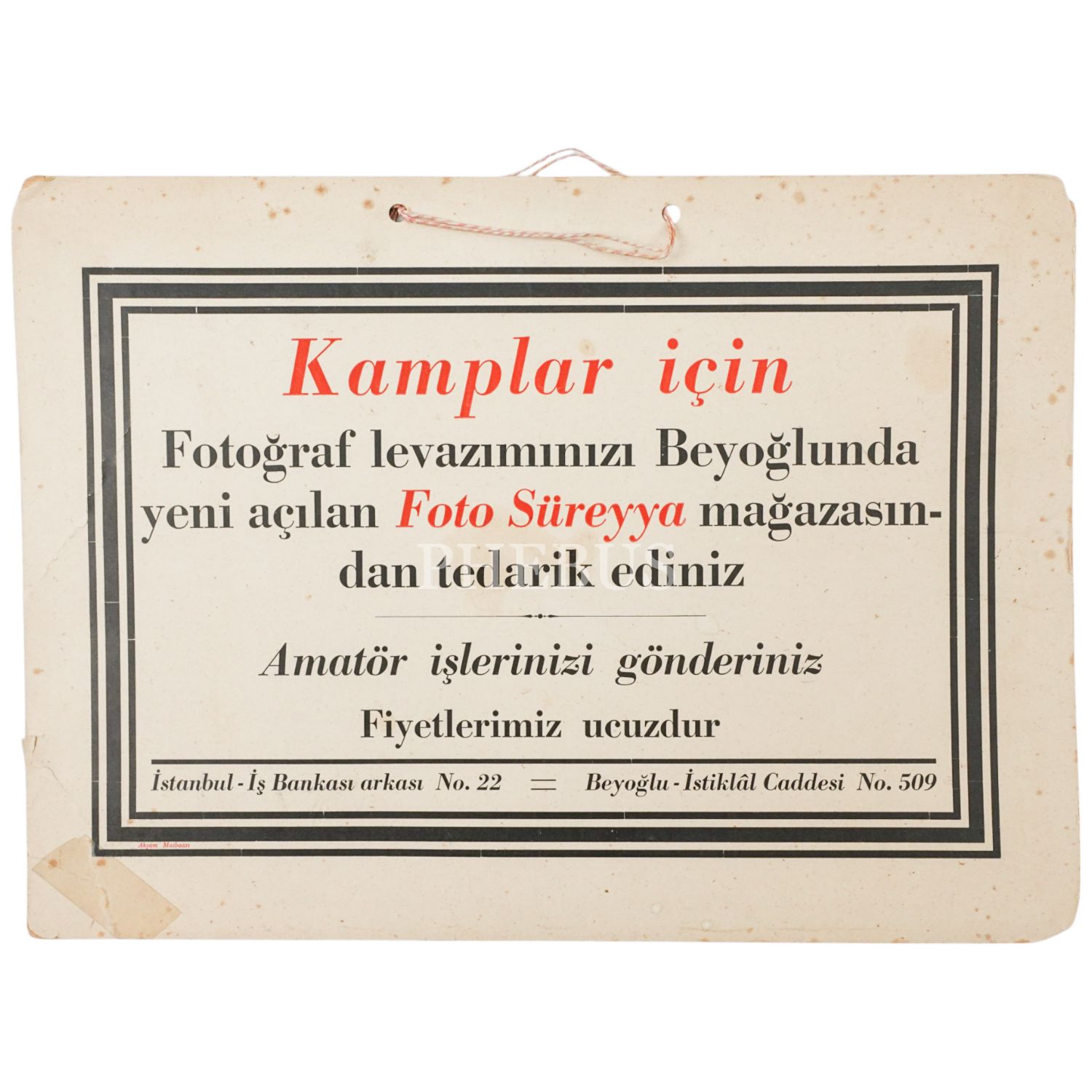 "Kamplar için Fotoğraf levazımınızı Beyoğlunda yeni açılan Foto Süreyya mağazasından tedarik ediniz" yazılı, Foto Süreyya´nın reklam tabelası, 32x23 cm..