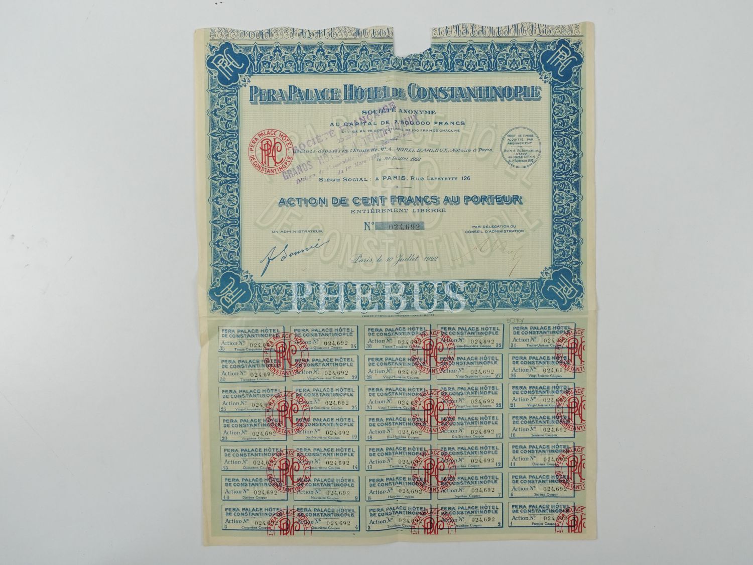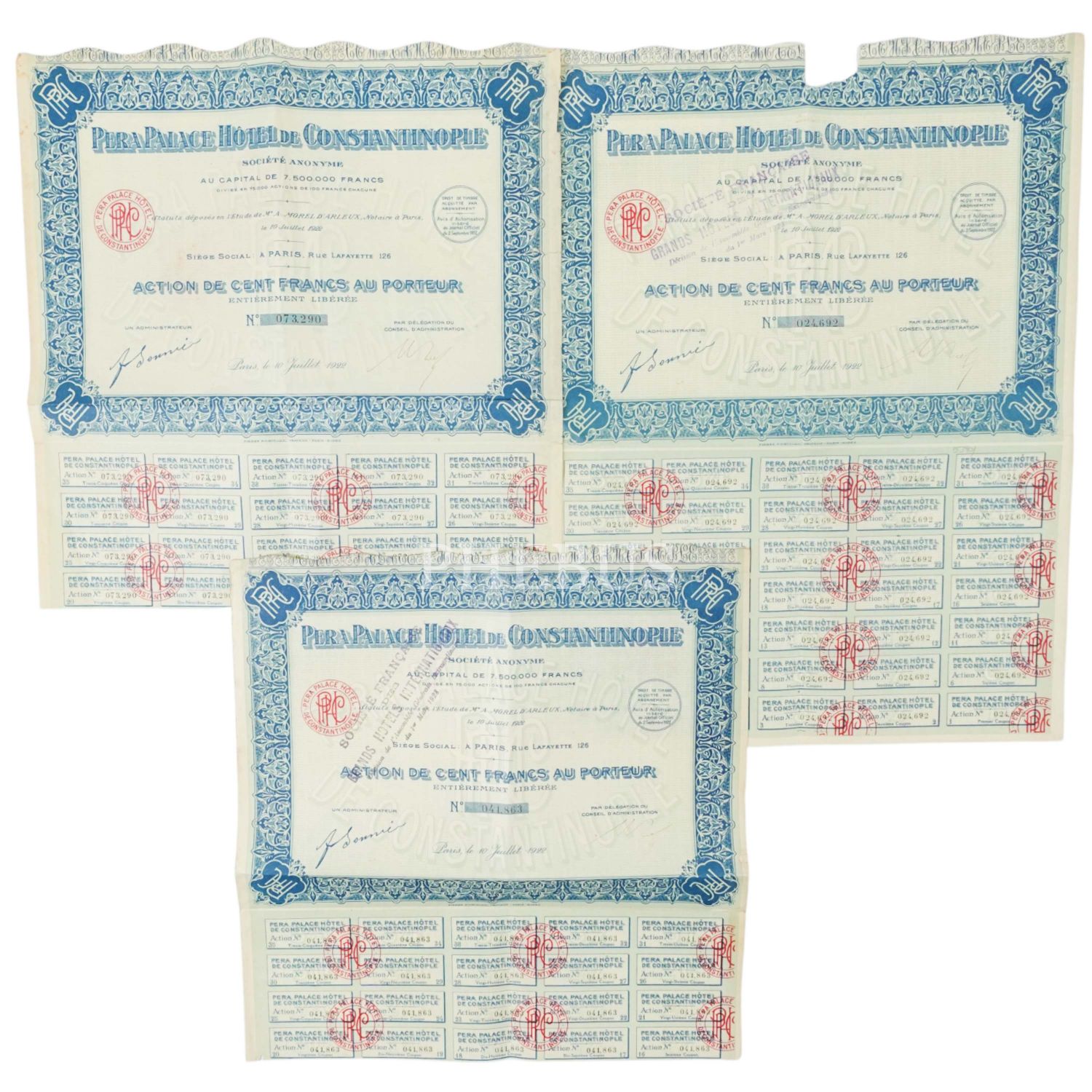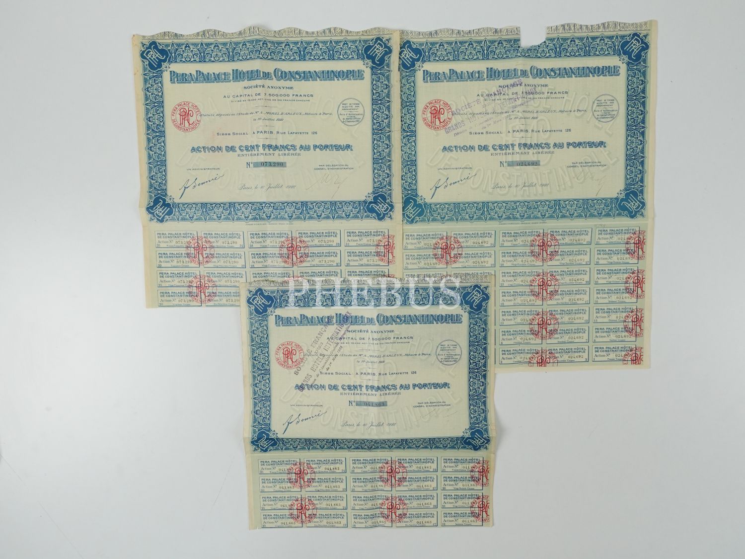 Pera Palace Oteli´nin Fransızca 3 adet hisse senedi, "Pera Palace Hotel de Constantinople", 32x33 cm...
