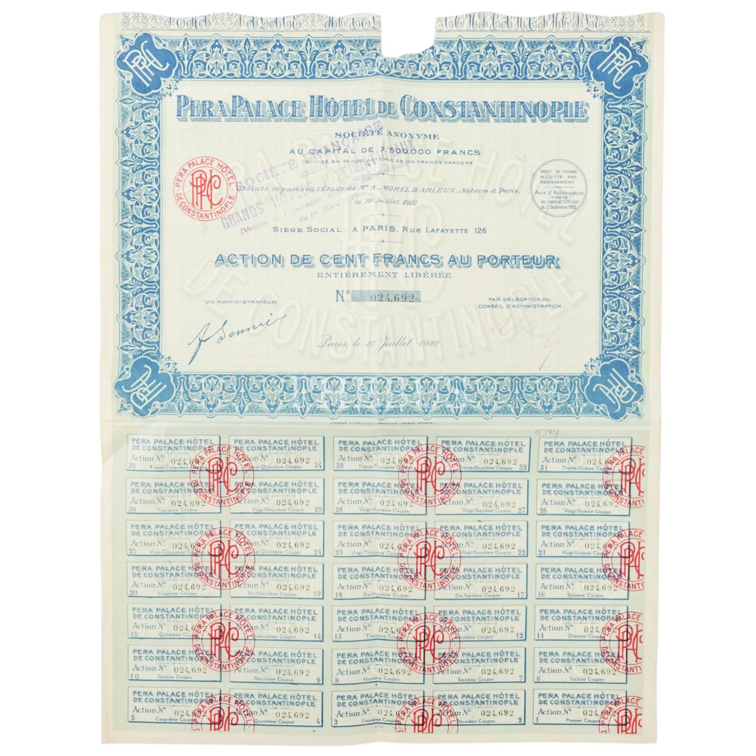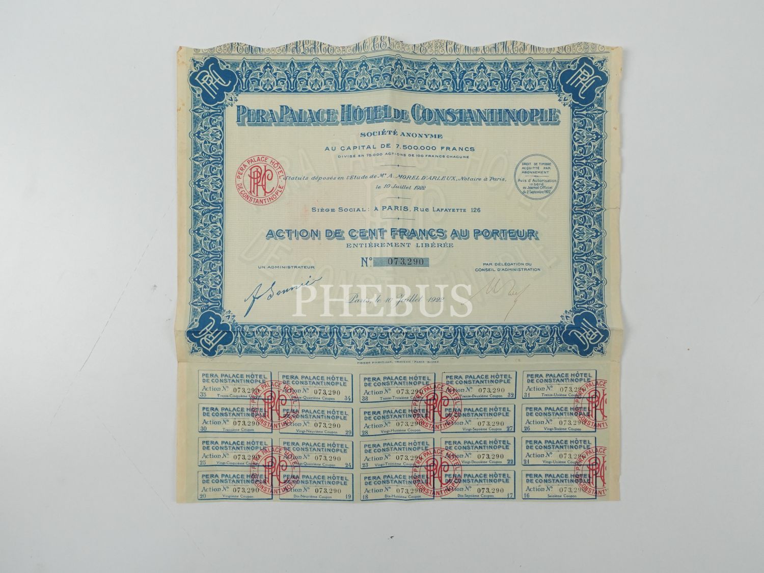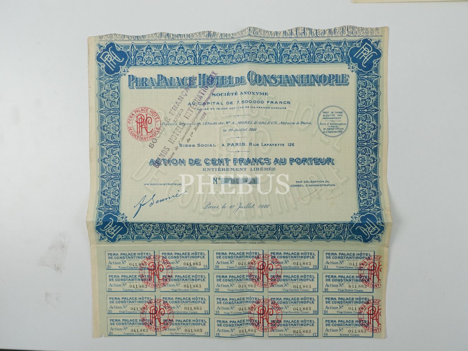 Pera Palace Oteli´nin Fransızca 3 adet hisse senedi, "Pera Palace Hotel de Constantinople", 32x33 cm...