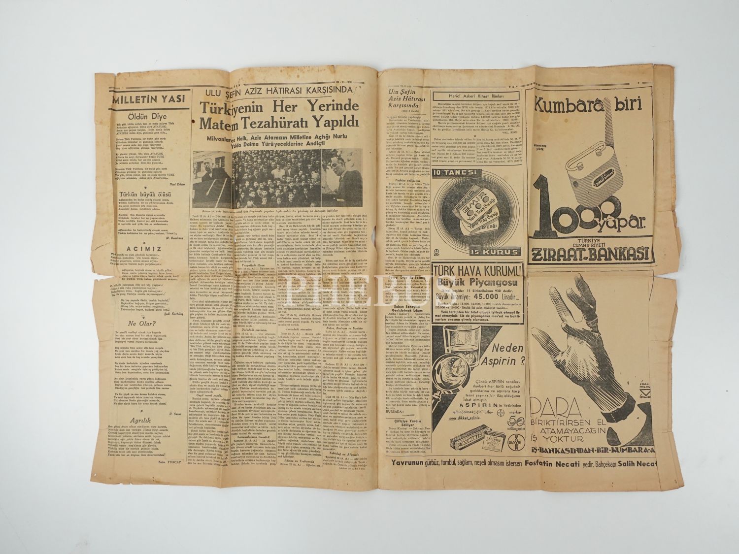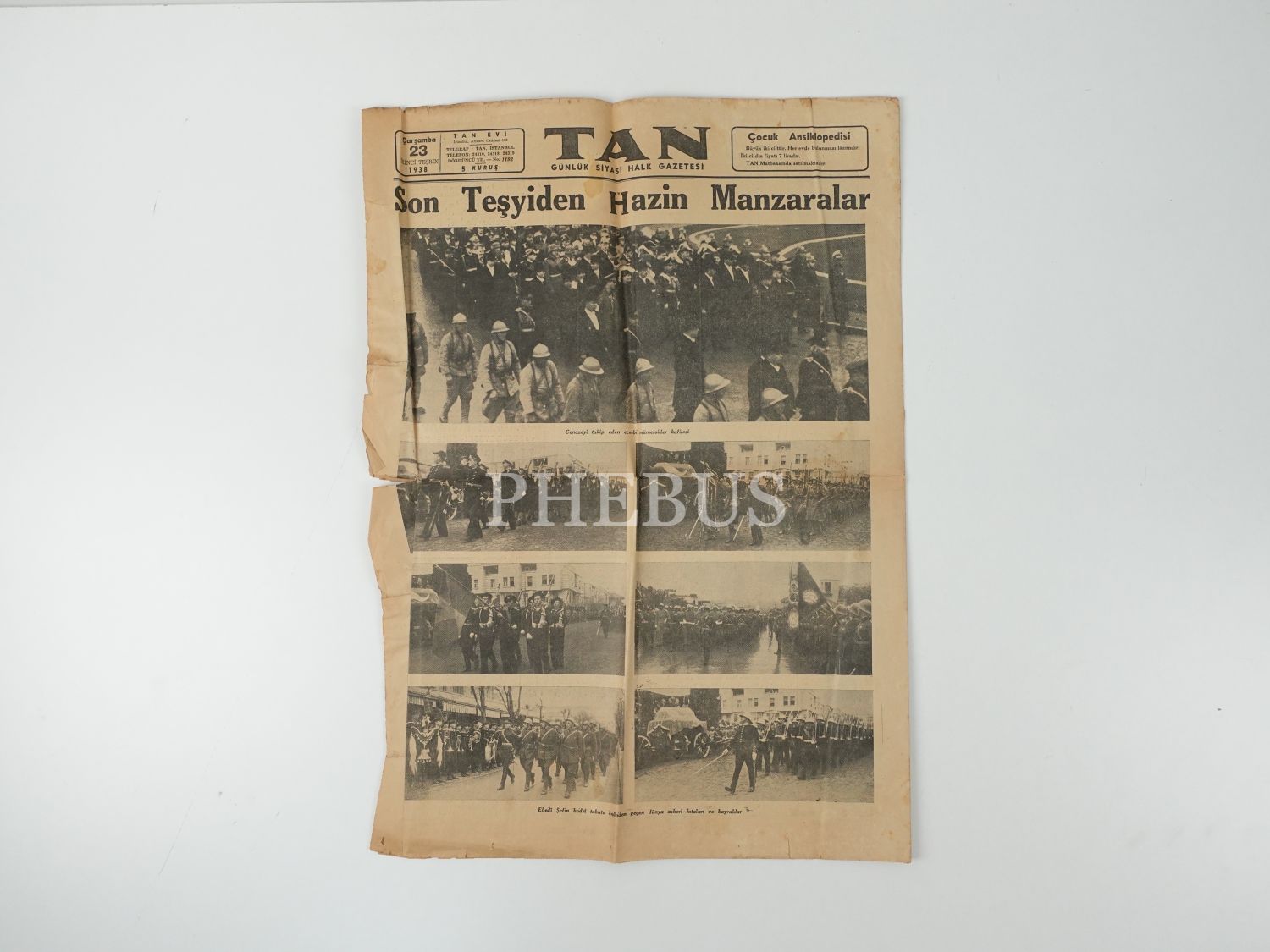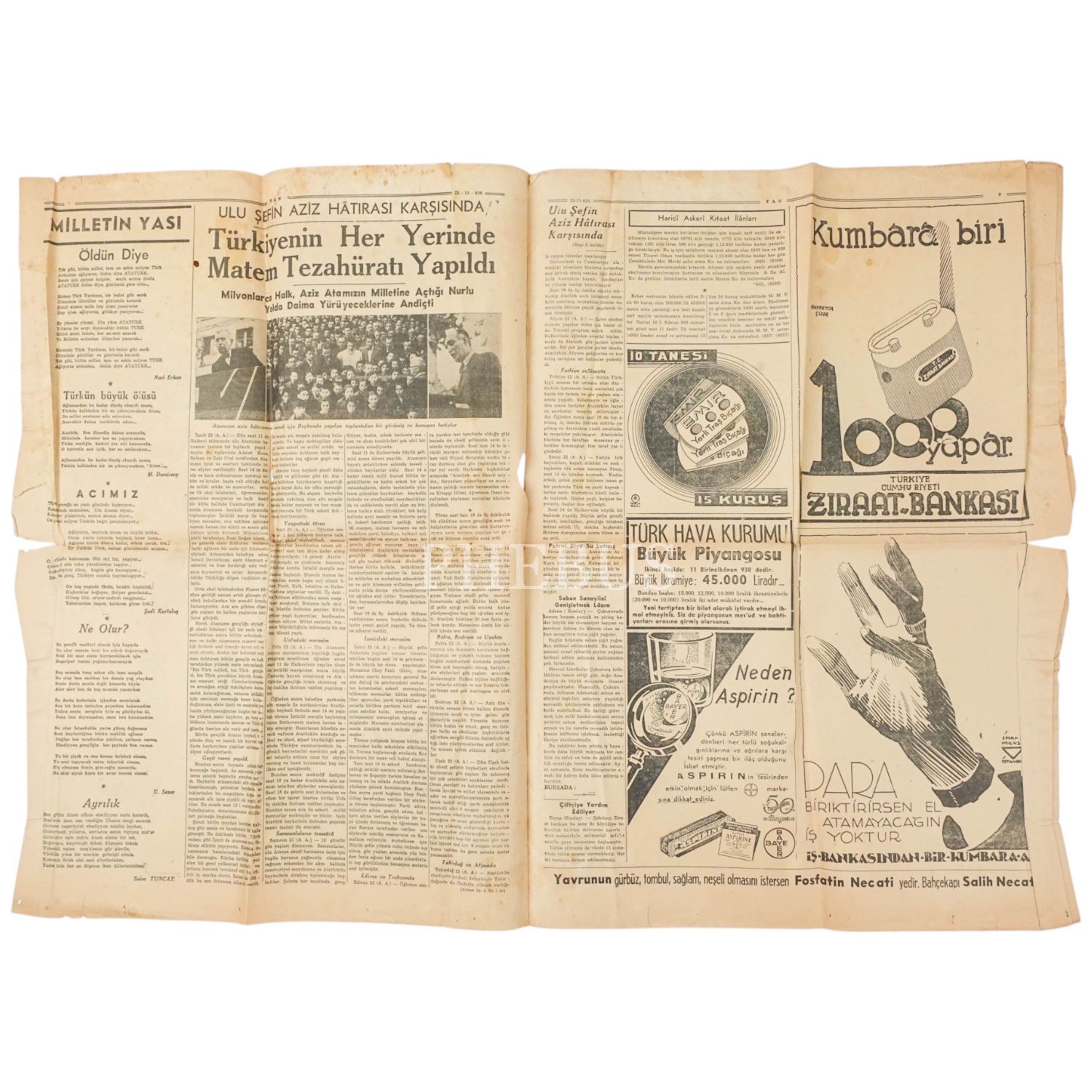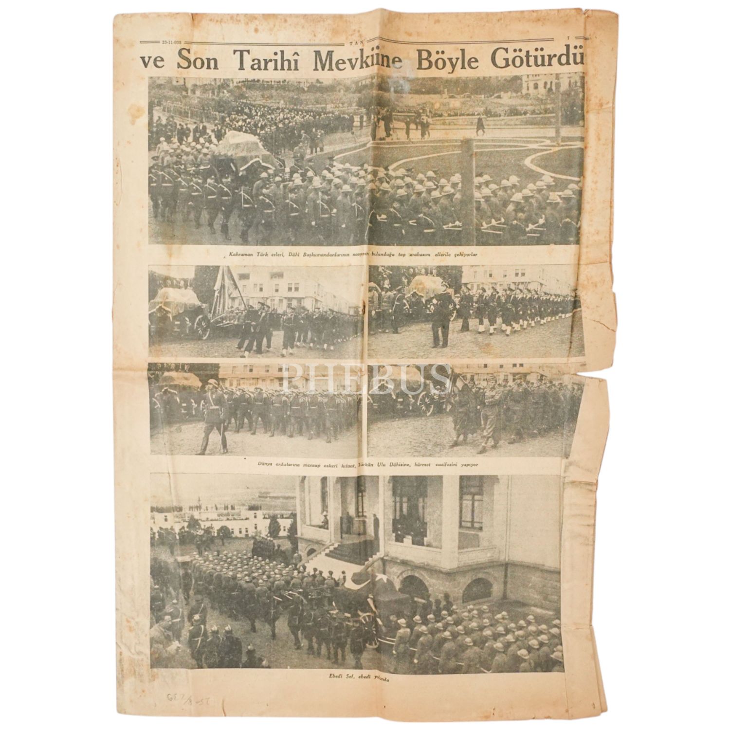 Mustafa Kemal Atatürk´ün aziz naaşının Ankara Etnografya Müzesi´ne defnini konu alan "Son Teşyiden Hazin Manzaralar" manşetli TAN gazetesi, 23 İkinciteşrin 1938, 40x57 cm...
