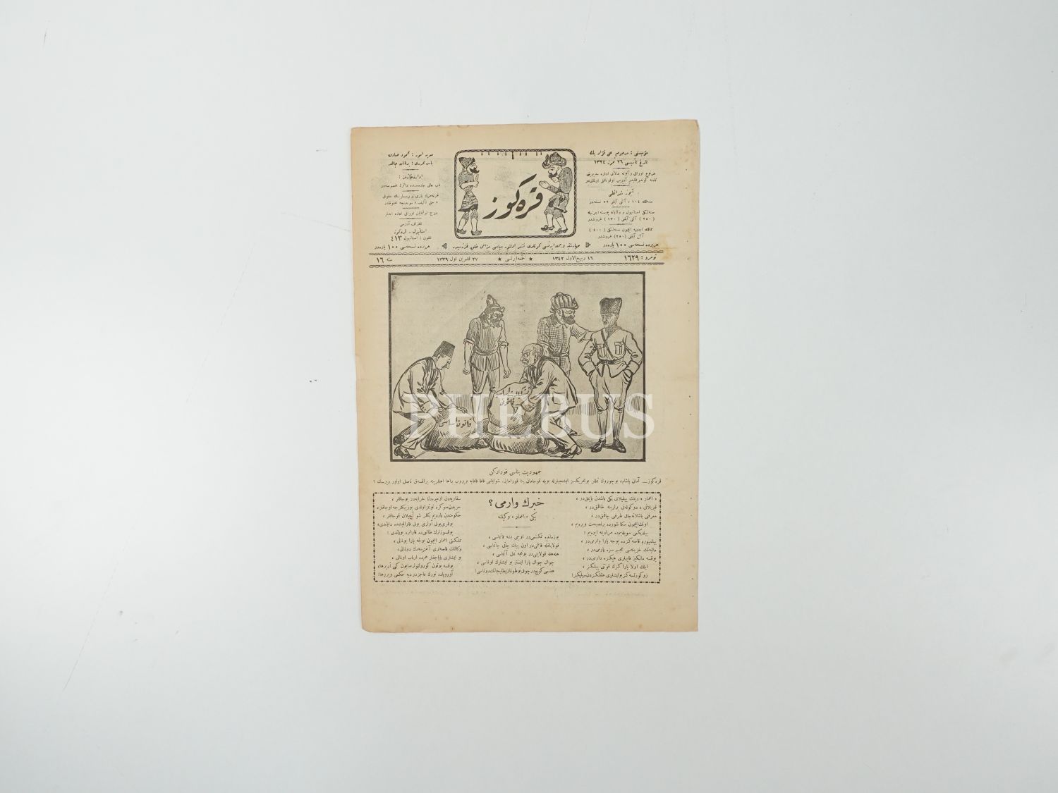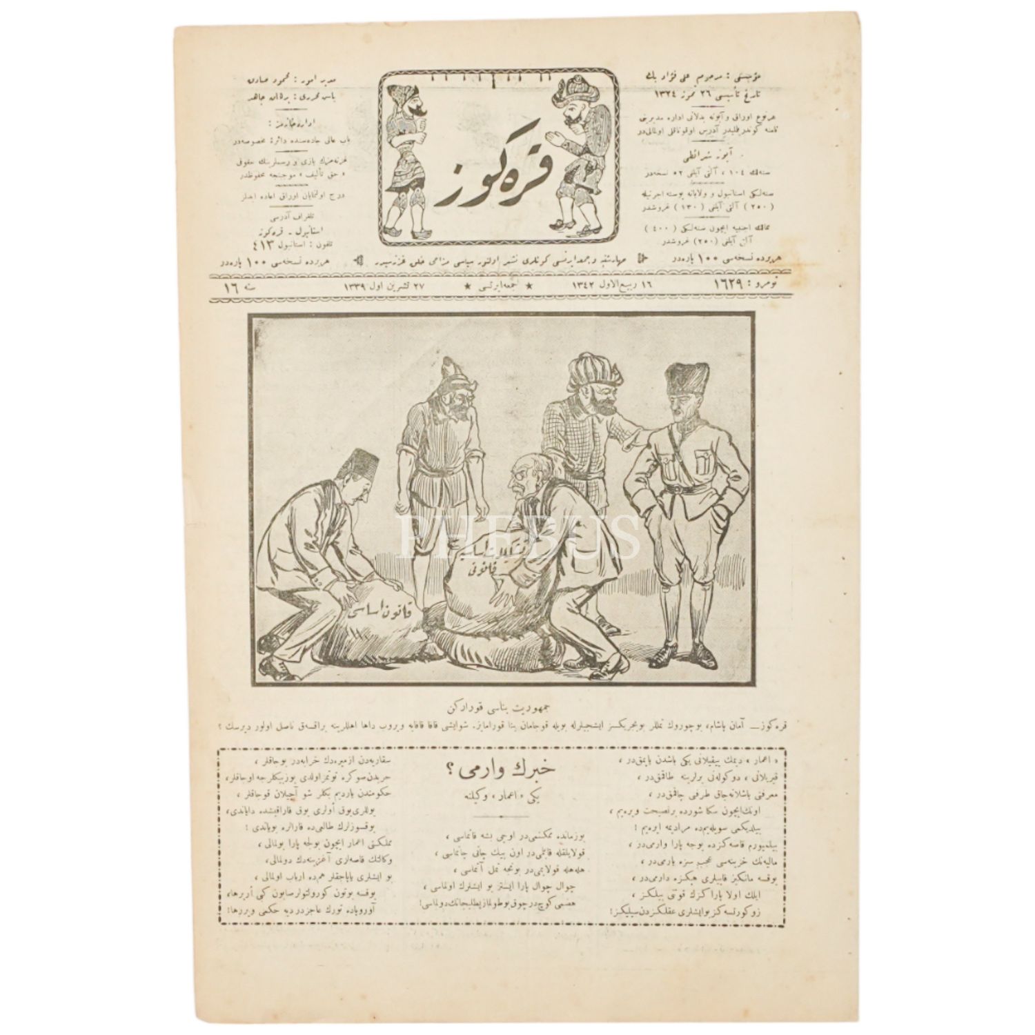 Mustafa Kemal Atatürk´ün yer aldığı "Cumhuriyet Binası Kurarken" alt başlıklı bir karikatüre kapağında yer veren KARAGÖZ dergisinin 27 Teşrinievvel 1339 tarihli nüshası, 27x40 cm...