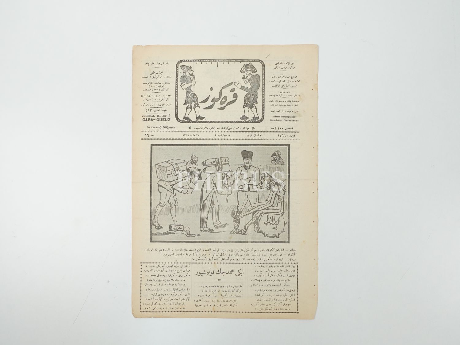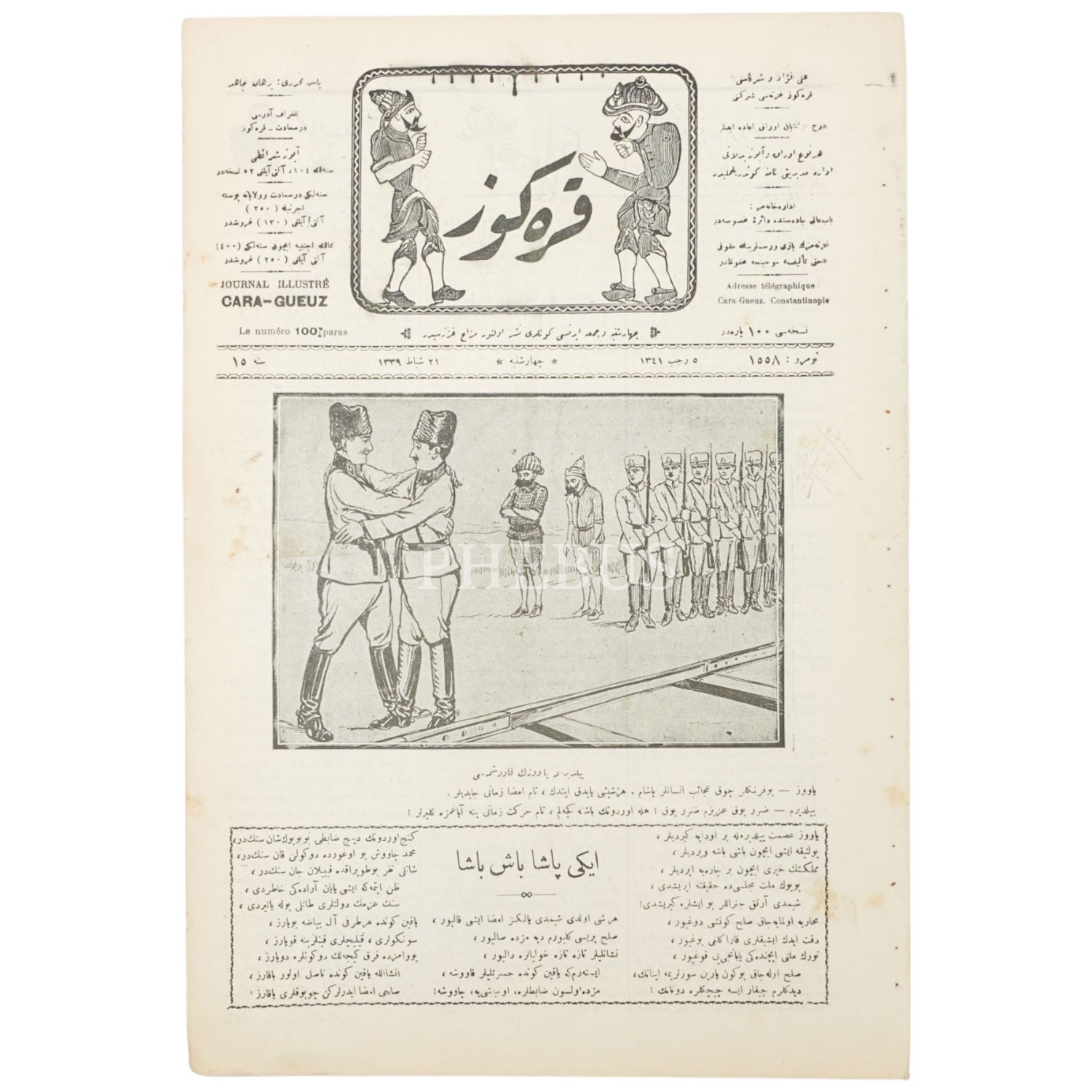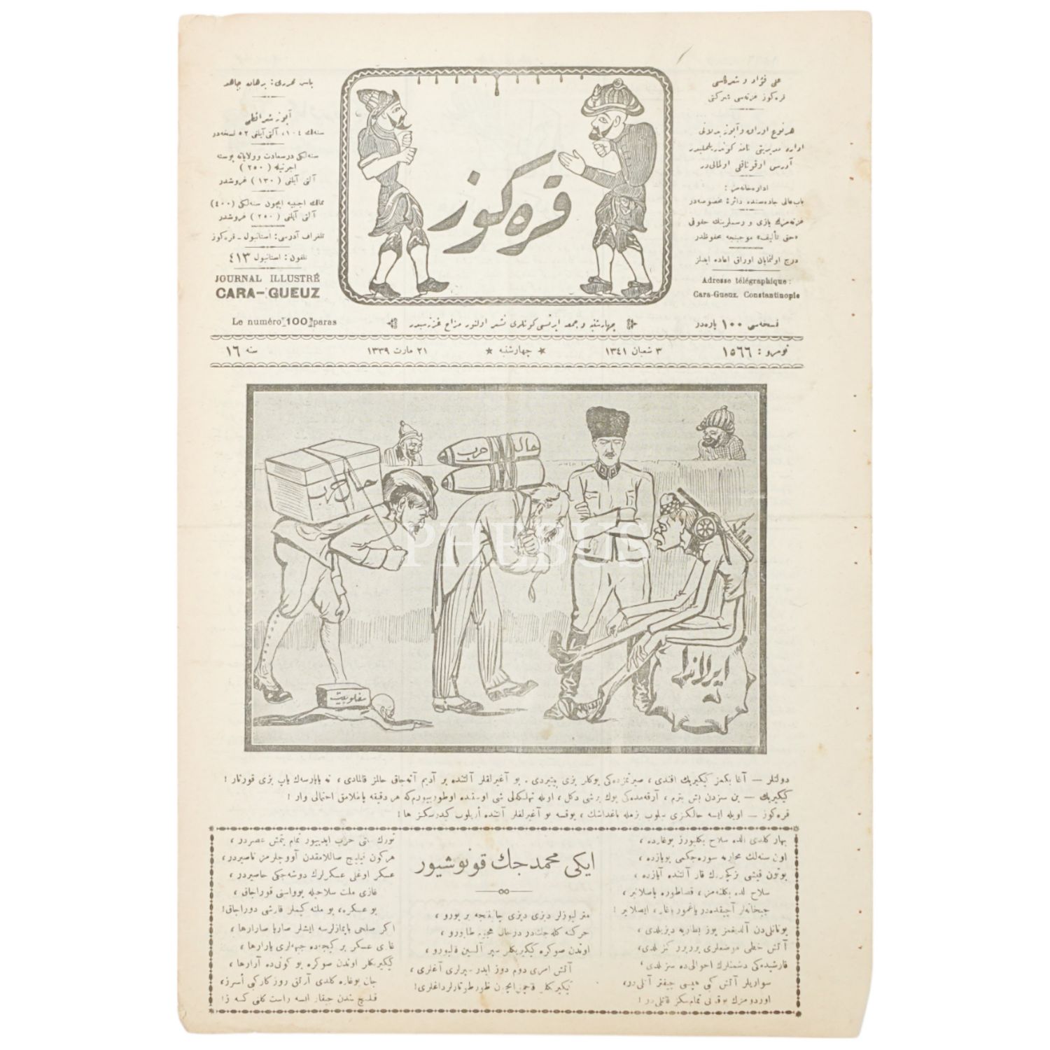 Mustafa Kemal Atatürk ve İsmet İnönü´nün resmedildiği, "Yıldırım ile Yavuz´un kavuşması" alt başlıklı bir karikatüre kapağında yer veren KARAGÖZ dergisinin 12 Şubat 1339 tarihli nüshası, 27x40 cm...