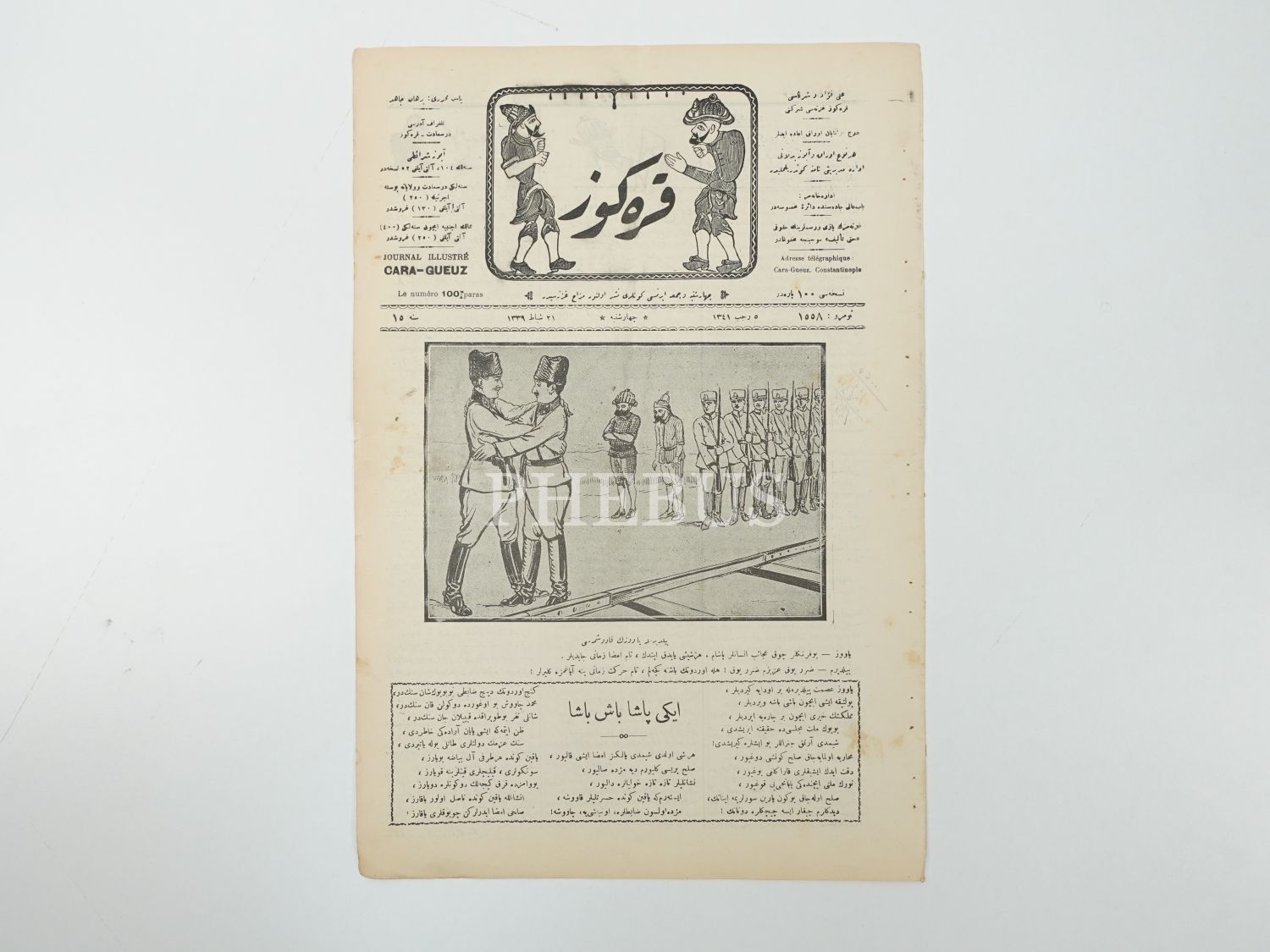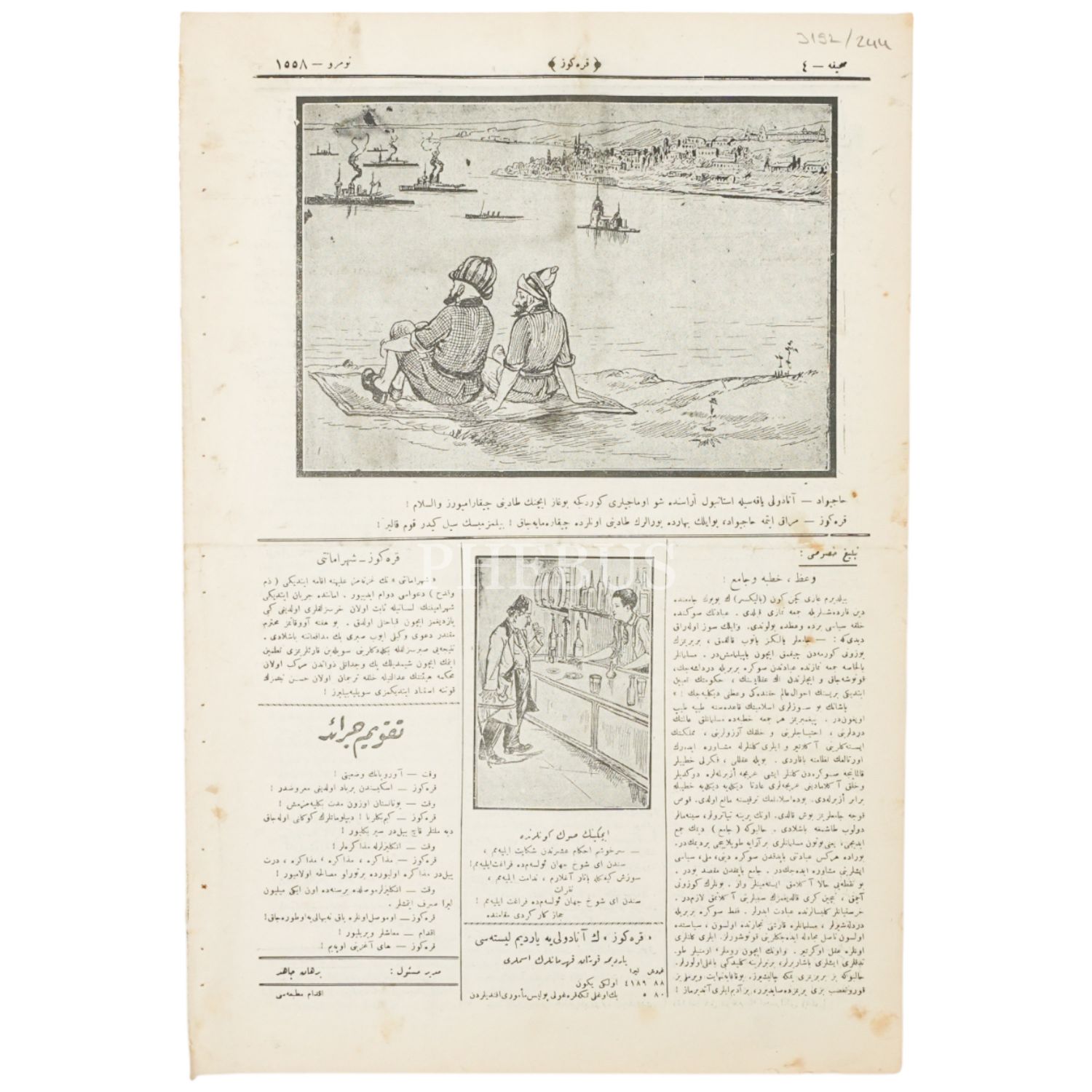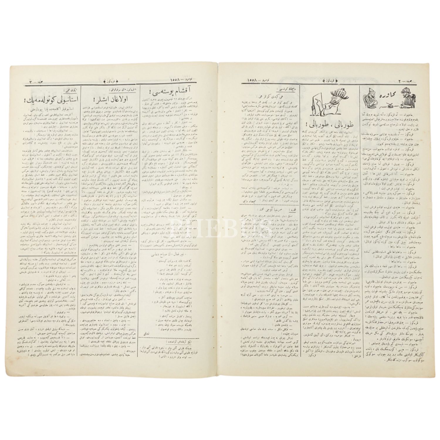 Mustafa Kemal Atatürk ve İsmet İnönü´nün resmedildiği, "Yıldırım ile Yavuz´un kavuşması" alt başlıklı bir karikatüre kapağında yer veren KARAGÖZ dergisinin 12 Şubat 1339 tarihli nüshası, 27x40 cm...