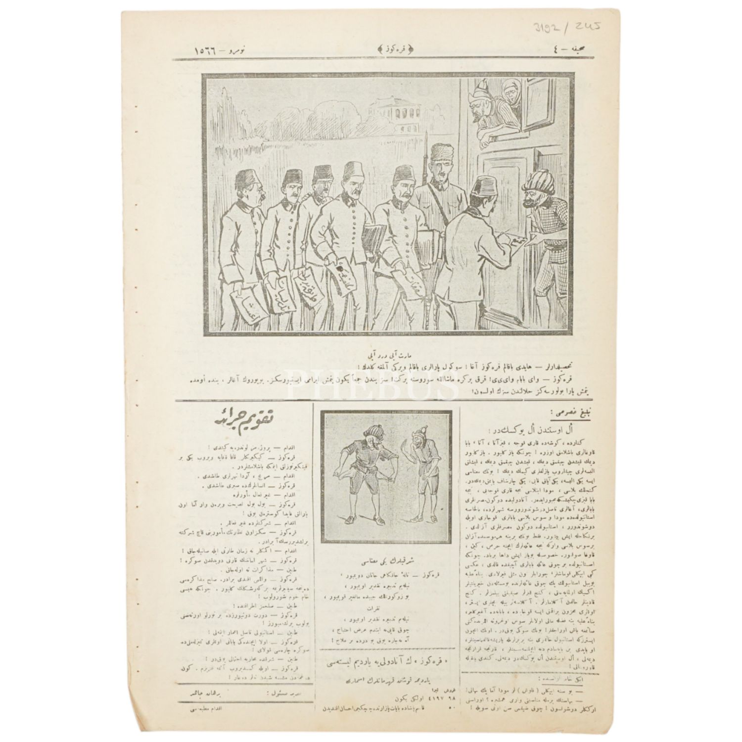 İngiltere, İtalya ve Fransa devletlerinin mağlubiyet altında ezildikleri, Mustafa Kemal Atatürk´ün ise muzaffer bir edayla onları izlediği bir anın resmedildiği karikatüre kapağında yer veren KARAGÖZ dergisinin 21 Mart 1339 tarihli nüshası, 27x40 cm...