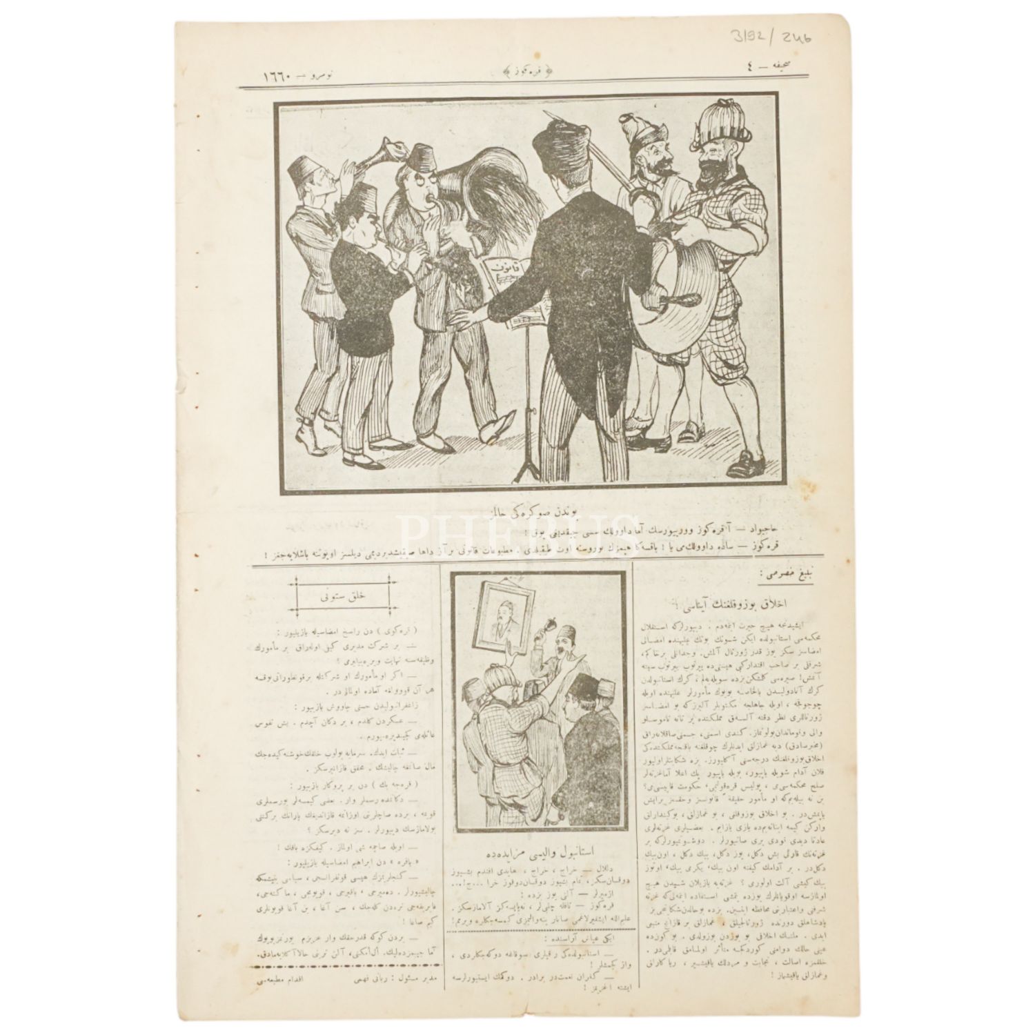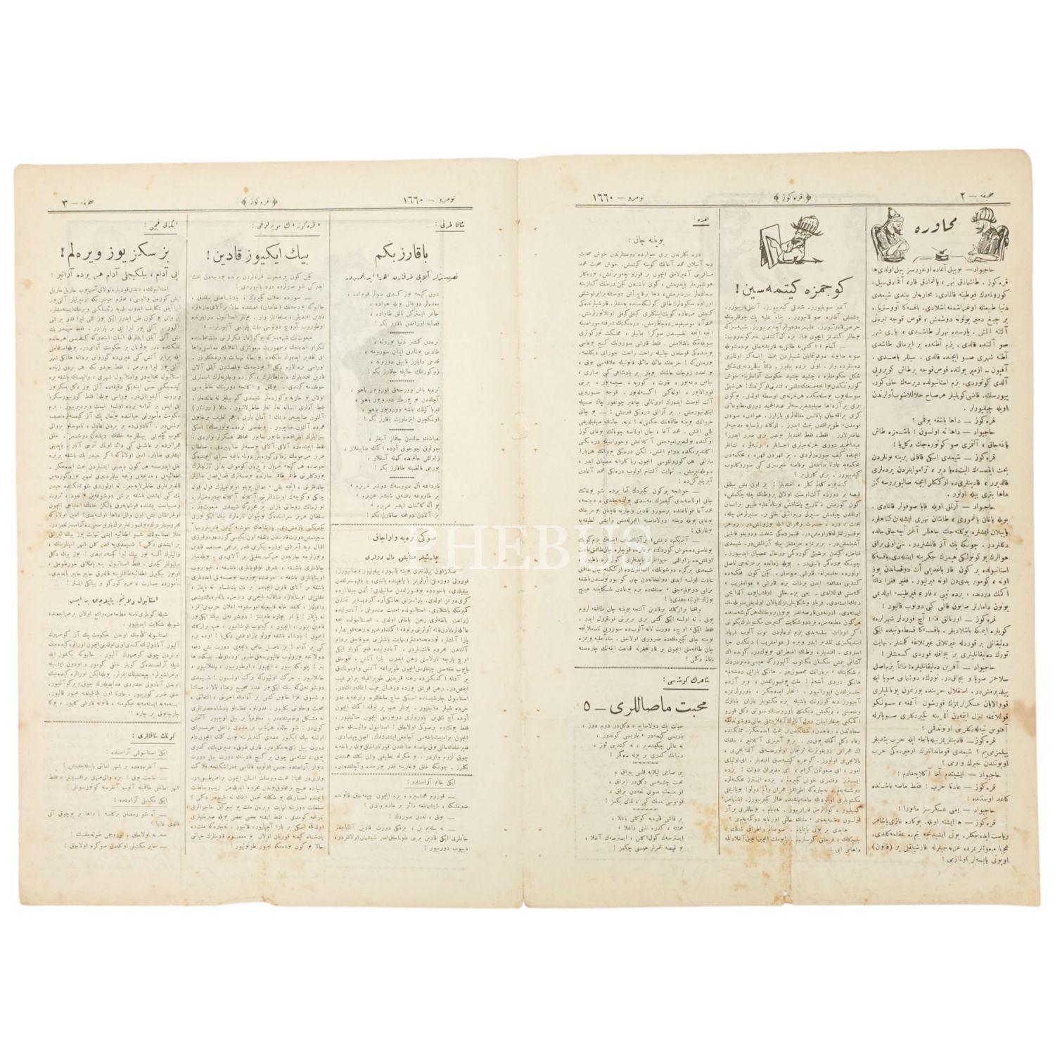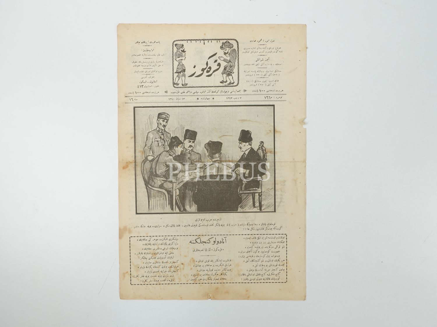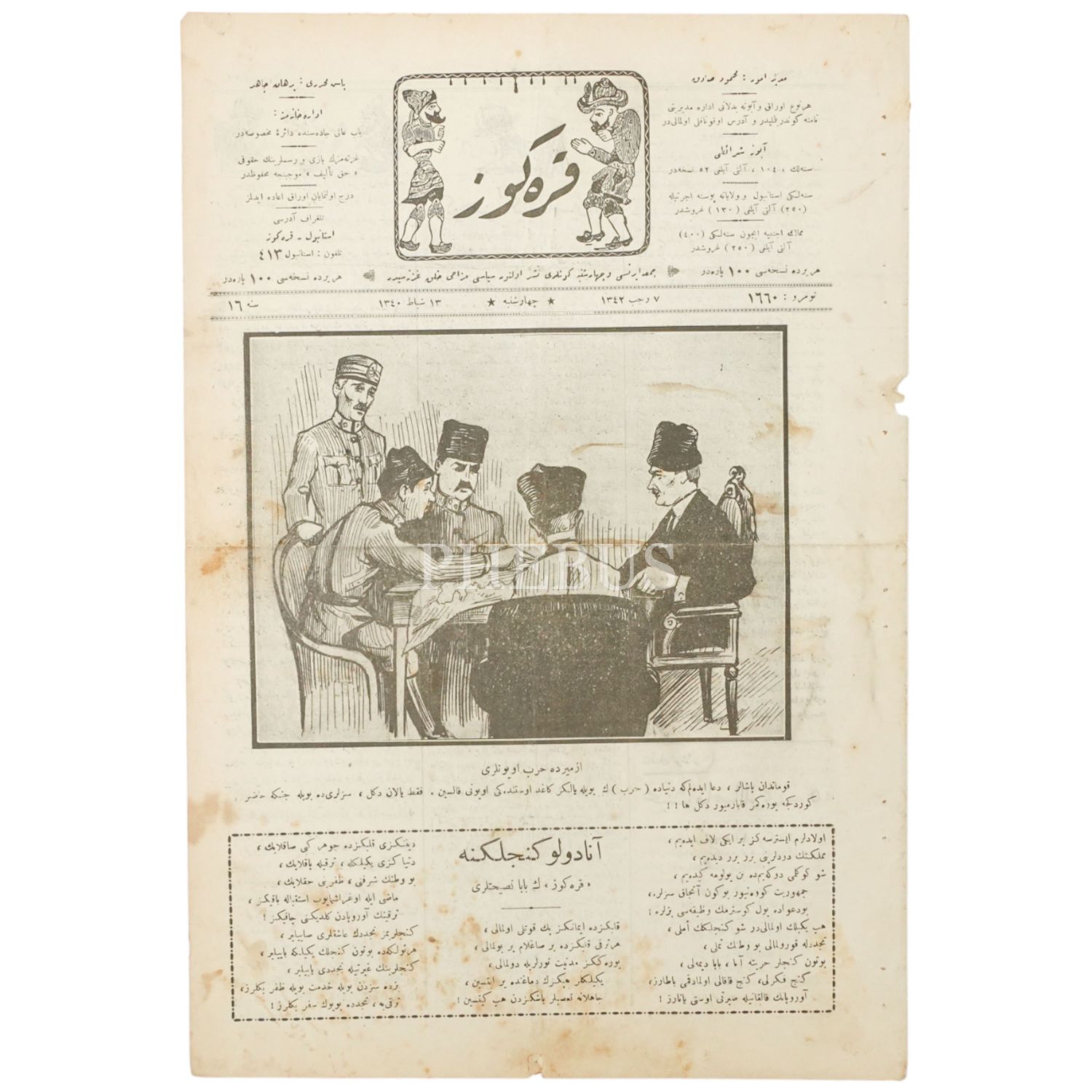 Mustafa Kemal Atatürk, Fevzi Çakmak ve İsmet İnönü´nün bir masa etrafında resmedildiği karikatüre kapağında yer veren KARAGÖZ dergisinin 13 Şubat 1340 tarihli nüshası, 27x41 cm...