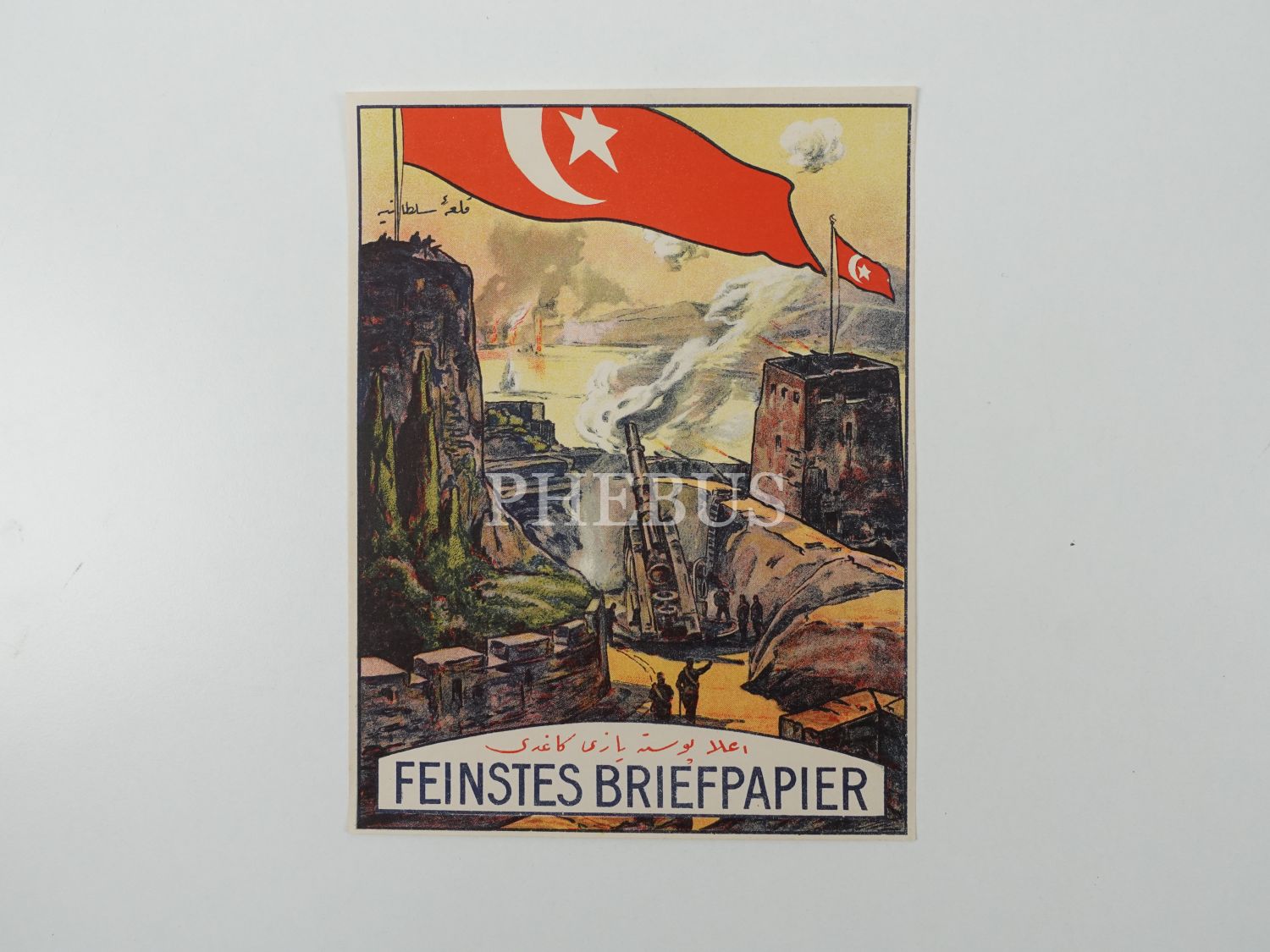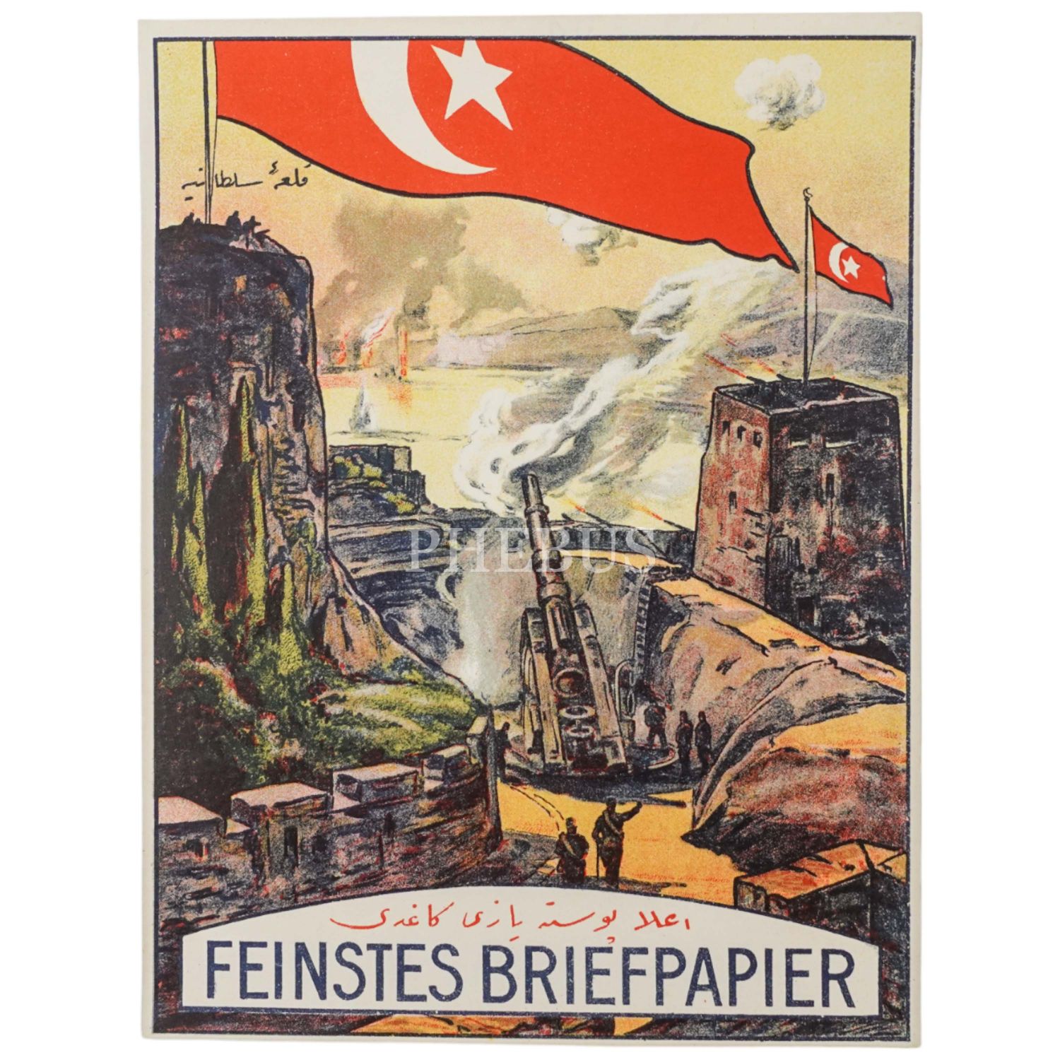 Çanakkale Boğazı´nın Asya Kıtası´nda yer alan Kale-i Sultaniye´den (Çimenlik Kalesi) top atışı görüntülerini içeren "Feinstes Briefpapier" marka, Osmanlıca-Fransızca yazılı posta kağıdı reklamı, 19x24 cm...