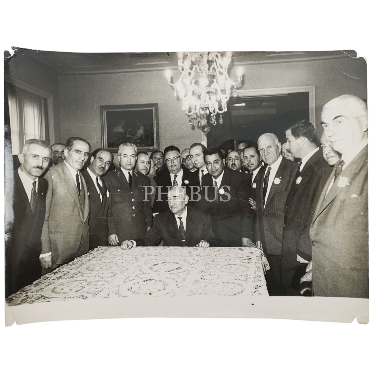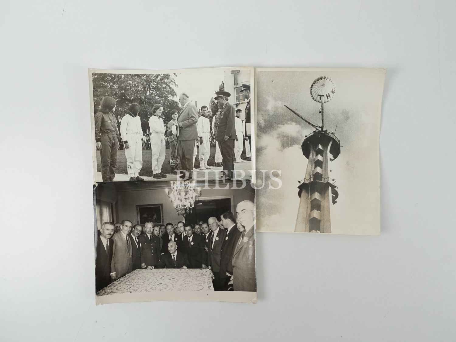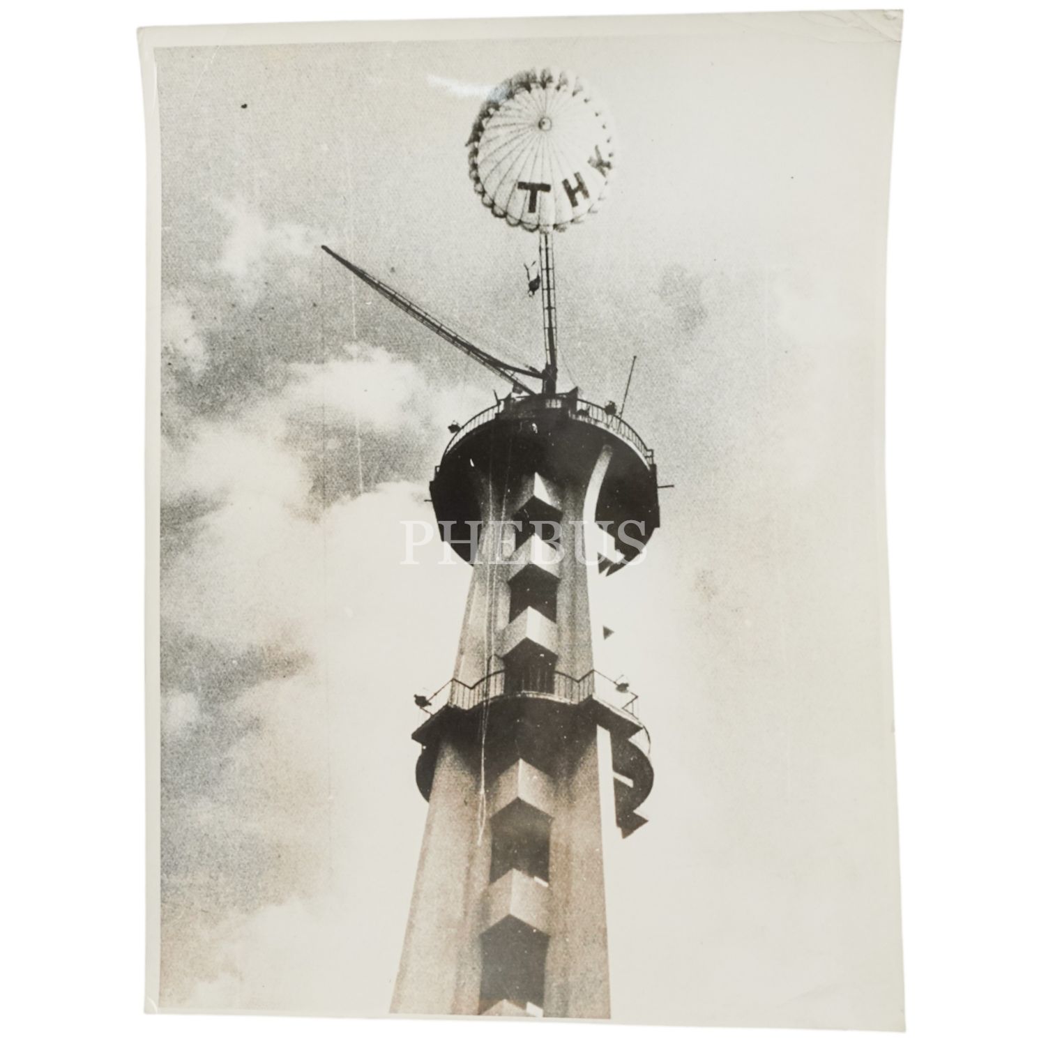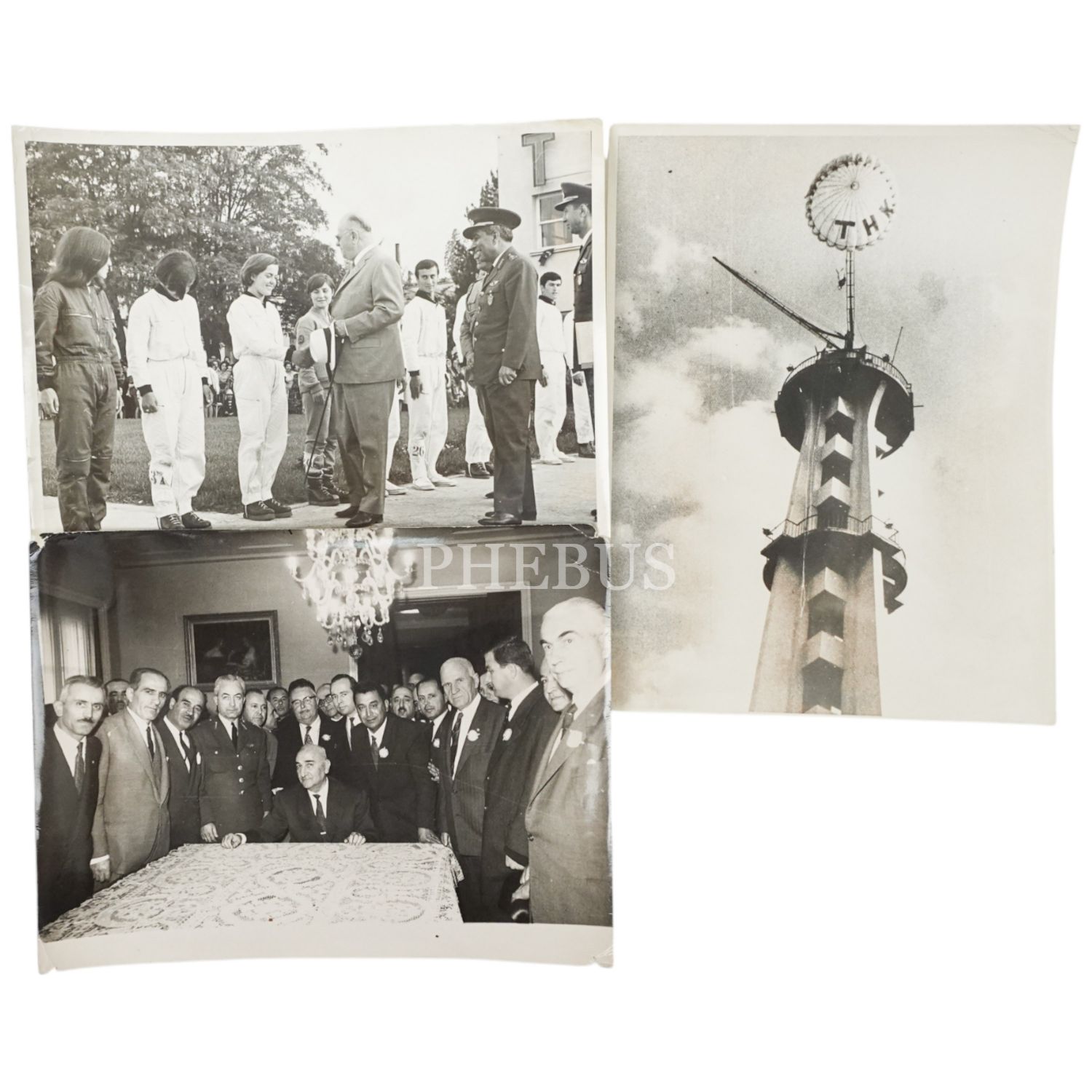 Türk Hava Kurumu´nun İzmir Fuarı´nda kurduğu Paraşüt Kulesi´nin, Cemal Gürsel ve Cevdet Sunay´ın görüldüğü 3 adet fotoğraf, 24x19 cm...