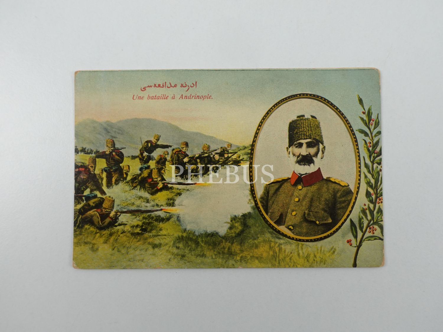 Edirne Müdafii Mehmed Şükrü Paşa ve Edirne´de düşmanla çatışan Osmanlı askerlerinin resmedildiği kartpostal, "Edirne Müdafaası - Une bataille a Andrinople", 14x9 cm...