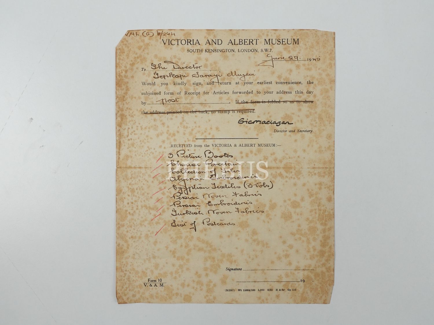 Victoria ve Albert Müzesi Müdürü Eric Maclagan´ın ıslak imzasını taşıyan ve Topkapı Sarayı Müzesi müdürüne gönderilmiş evrak, 19x24 cm...