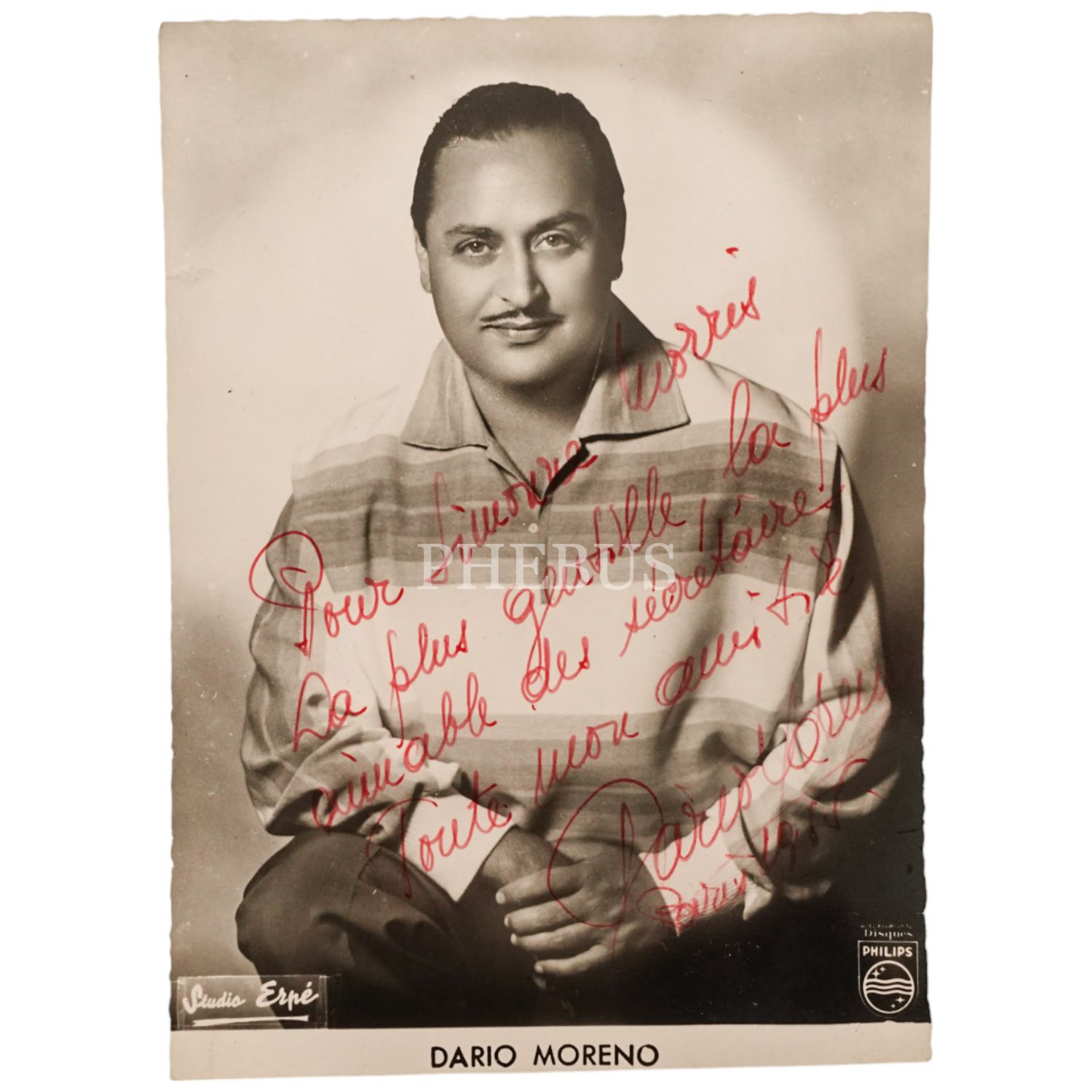 Aydın doğumlu Yahudi asıllı Müzisyen Dario Moreno´nun ithaflı ve imzalı fotoğrafı, 11x14 cm...