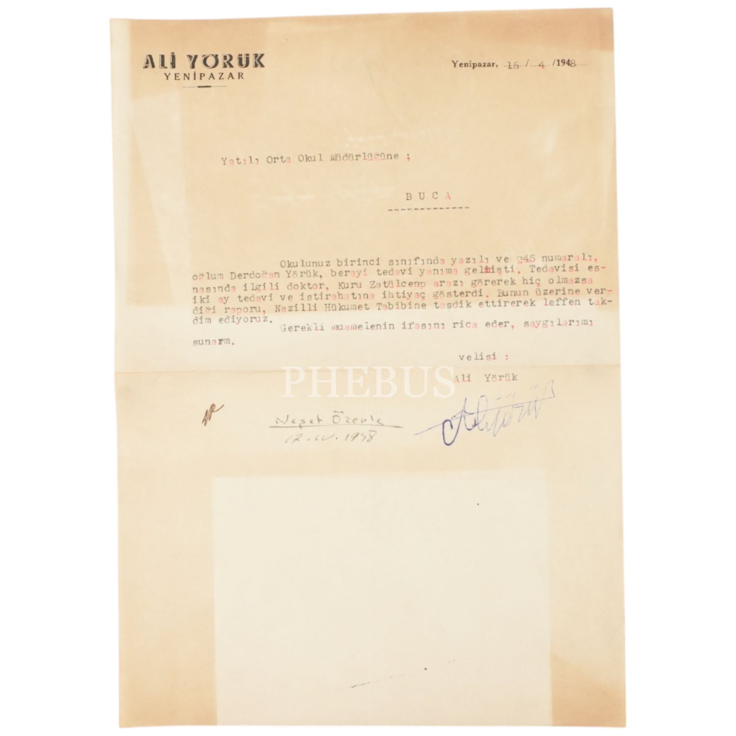 "Ali Yörük - Yenipazar" antetli mektup, 1948, 20x28 cm...