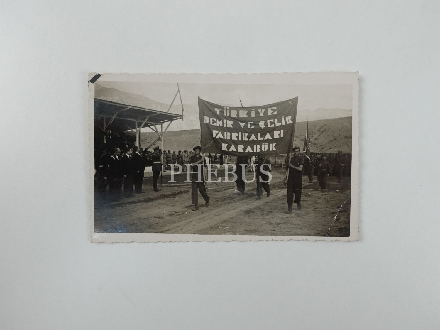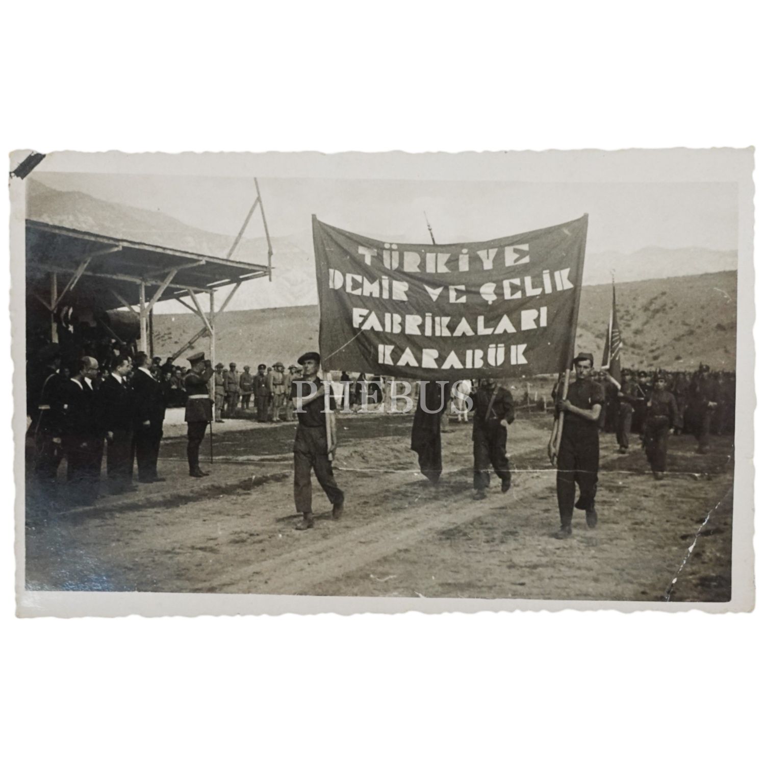 "Türkiye Demir ve Çelik Fabrikaları Karabük" yazılı pankart taşıyan işçiler, 14x9 cm...