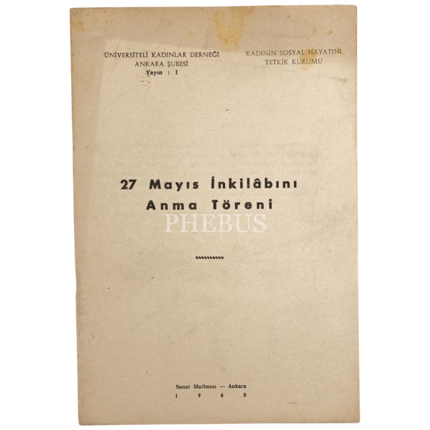 27 MAYIS İNKILABINI ANMA TÖRENİ, Kadının Sosyal Hayatını Tetkik Kurumu, 1960, Üniversiteli Kadınlar Ankara Şubesi, 22 sayfa, 17x24 cm...