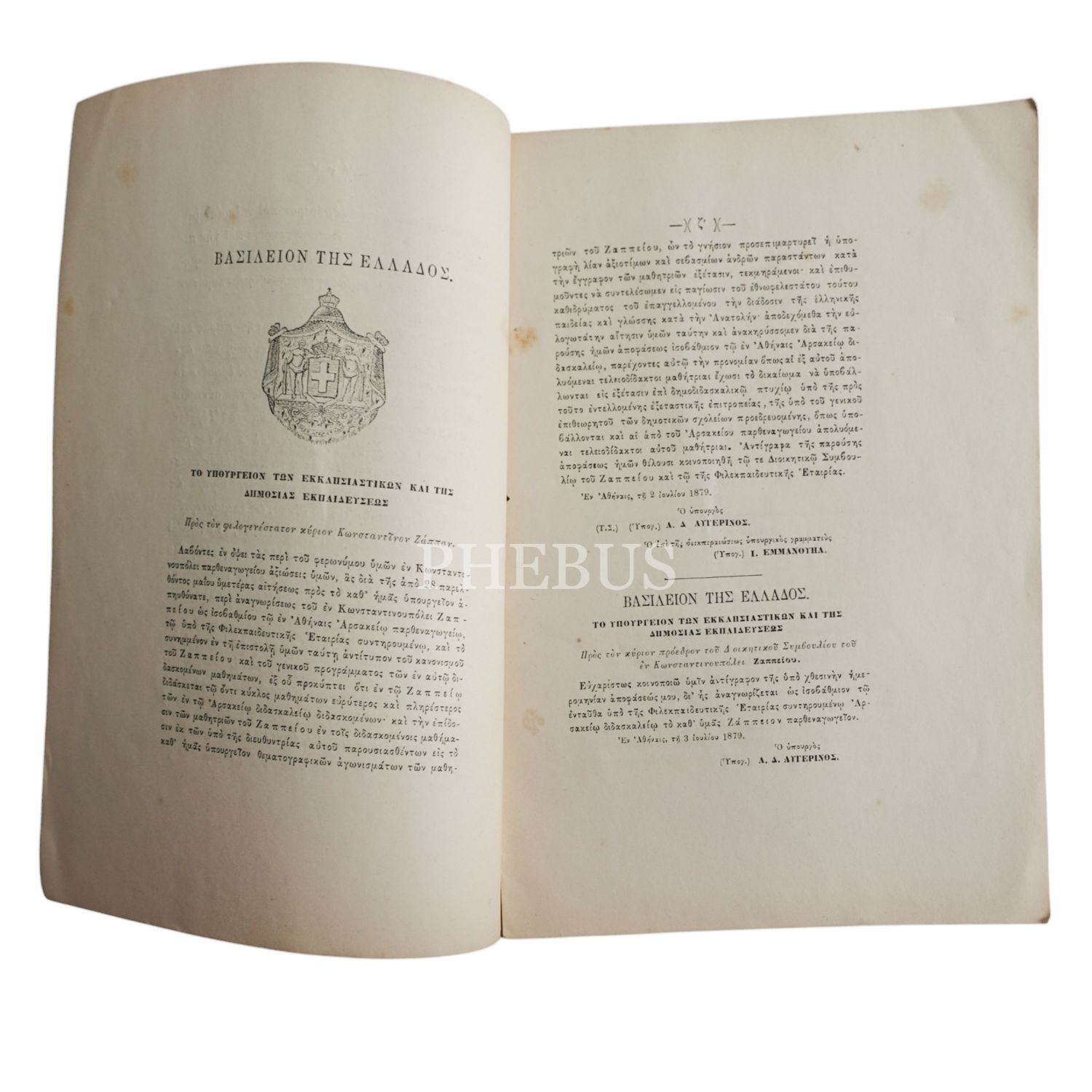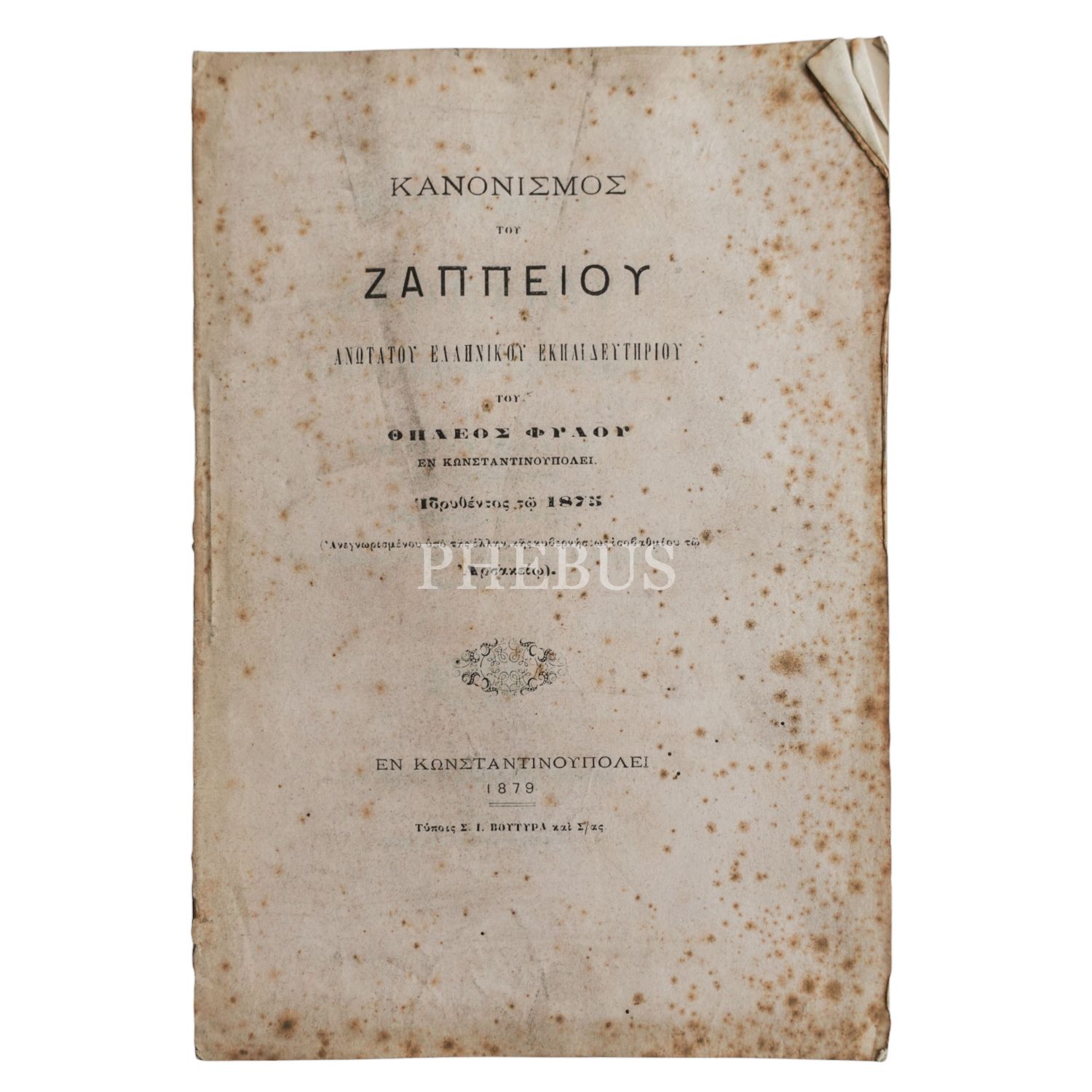 Rumca İstanbul Zapyon Yunan Kız Okulu´nun yönetmeliği, 1879, Voutira ve Ortakaları Matbaası (İstanbul), 16x24 cm...