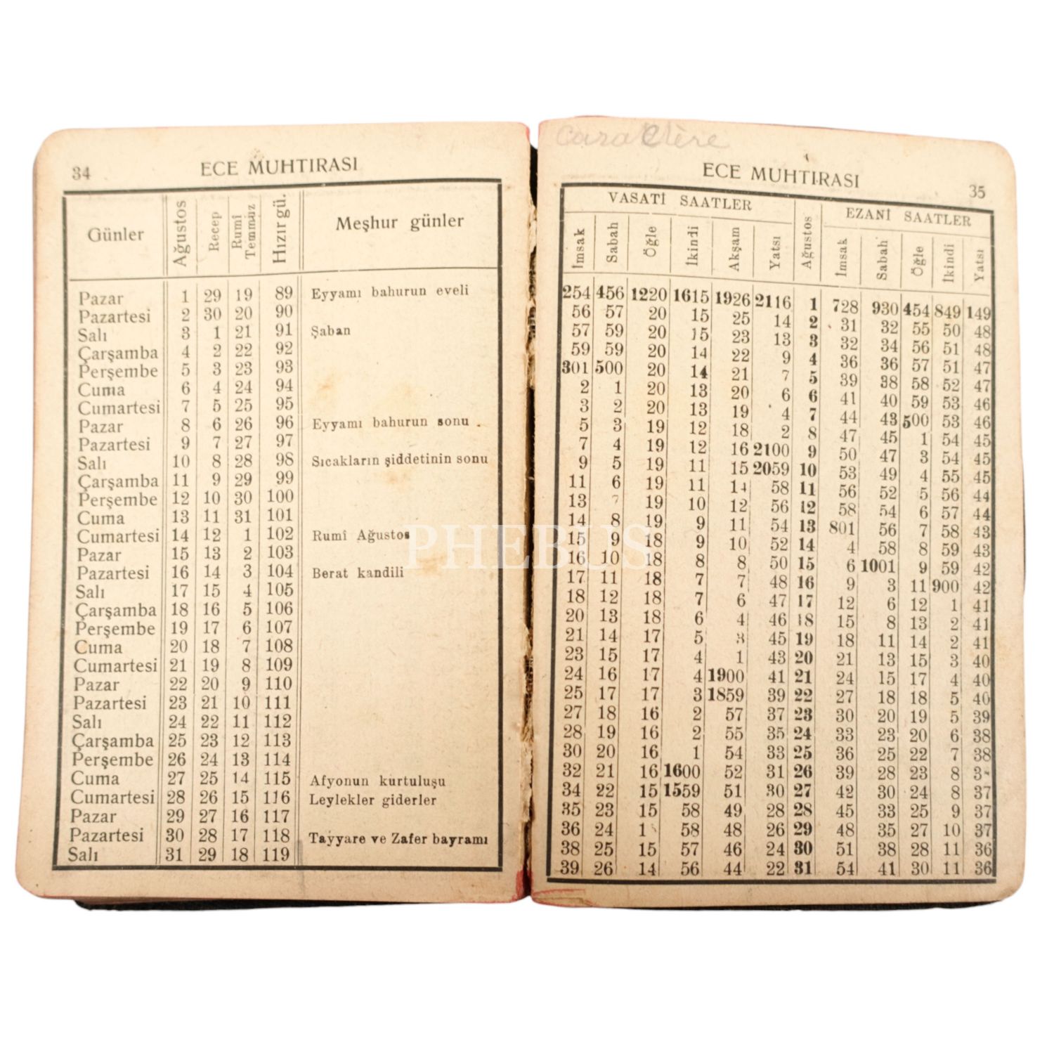 1. 1940 Aygün Bilgisi Ajandası.. 2. 1943 Ece Muhtırası... 3. 1945 Muhtıralı-Haritalı Hayat Takvimi... 4. 1944 Muhtıralı-Haritalı Hayat Takvimi... 5. 1950 Eriş Mağazası Ajandası.. 6.1947 Ece Muhtırası... 7. 1952 Ece Muhtırası... 8. Muhtıralı Takvim-i Ragıp... 9. 1948 Ece Muhtırası...