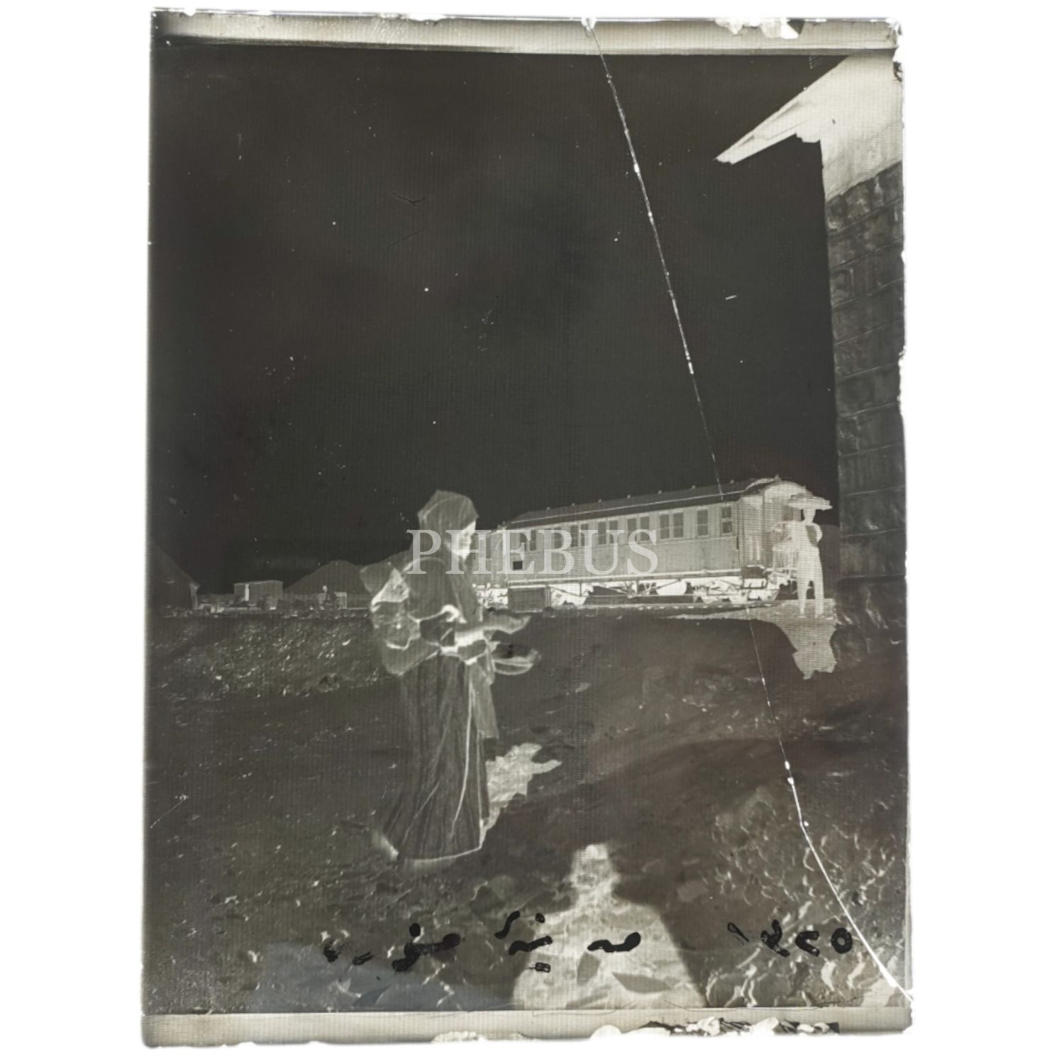 "1325 Medine-i Münevvere" yazılı, bir tren ve sırtında kundakladığı bir bebeğin görüldüğü cam negatif fotoğraf, 12x9 cm...