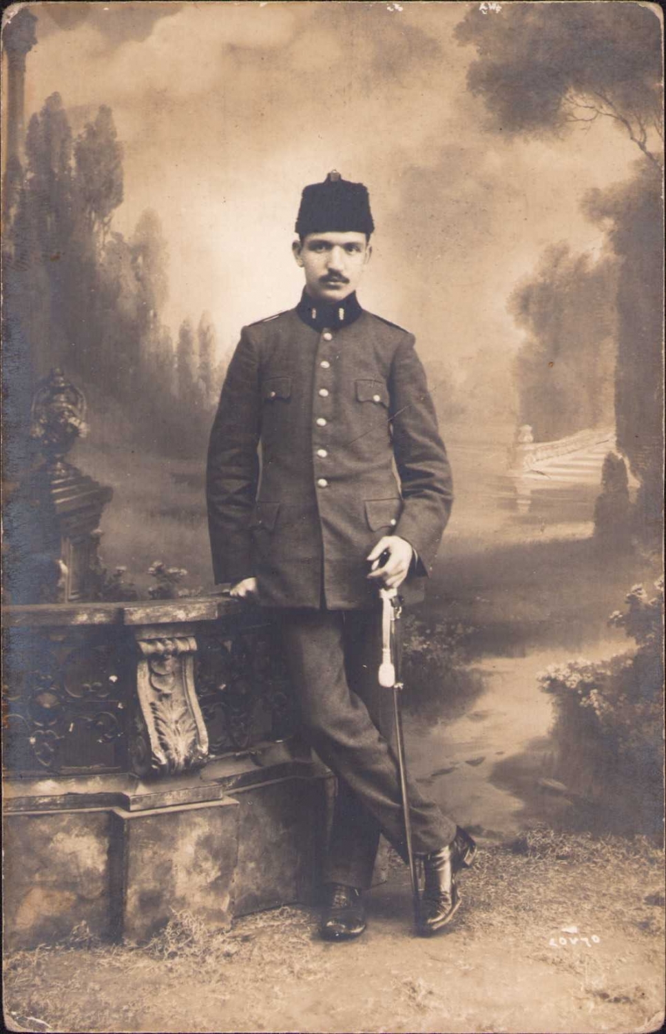 Kalpaklı kılıçlı tabip subay, Osmanlıca - Fransızca Resna Fotoğrafhanesi damgalı