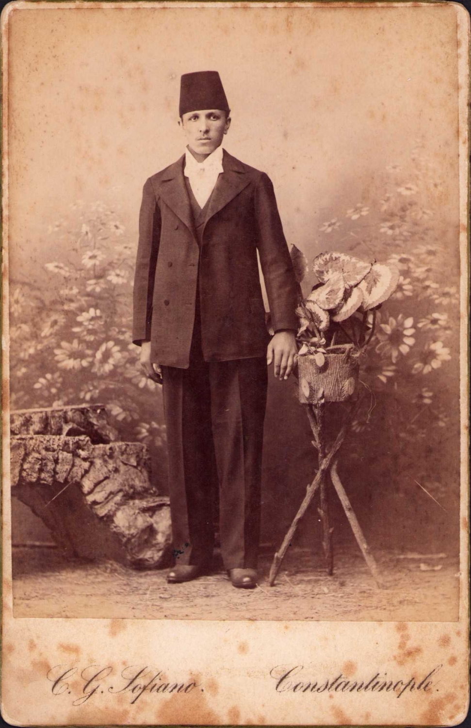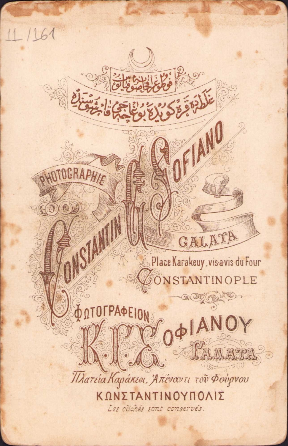 Photo Sofiano, fesli Osmanlı tip kabin foto, Osmanlıca, Fransızca, Rumca üç dilde yazılı, 10x15 cm