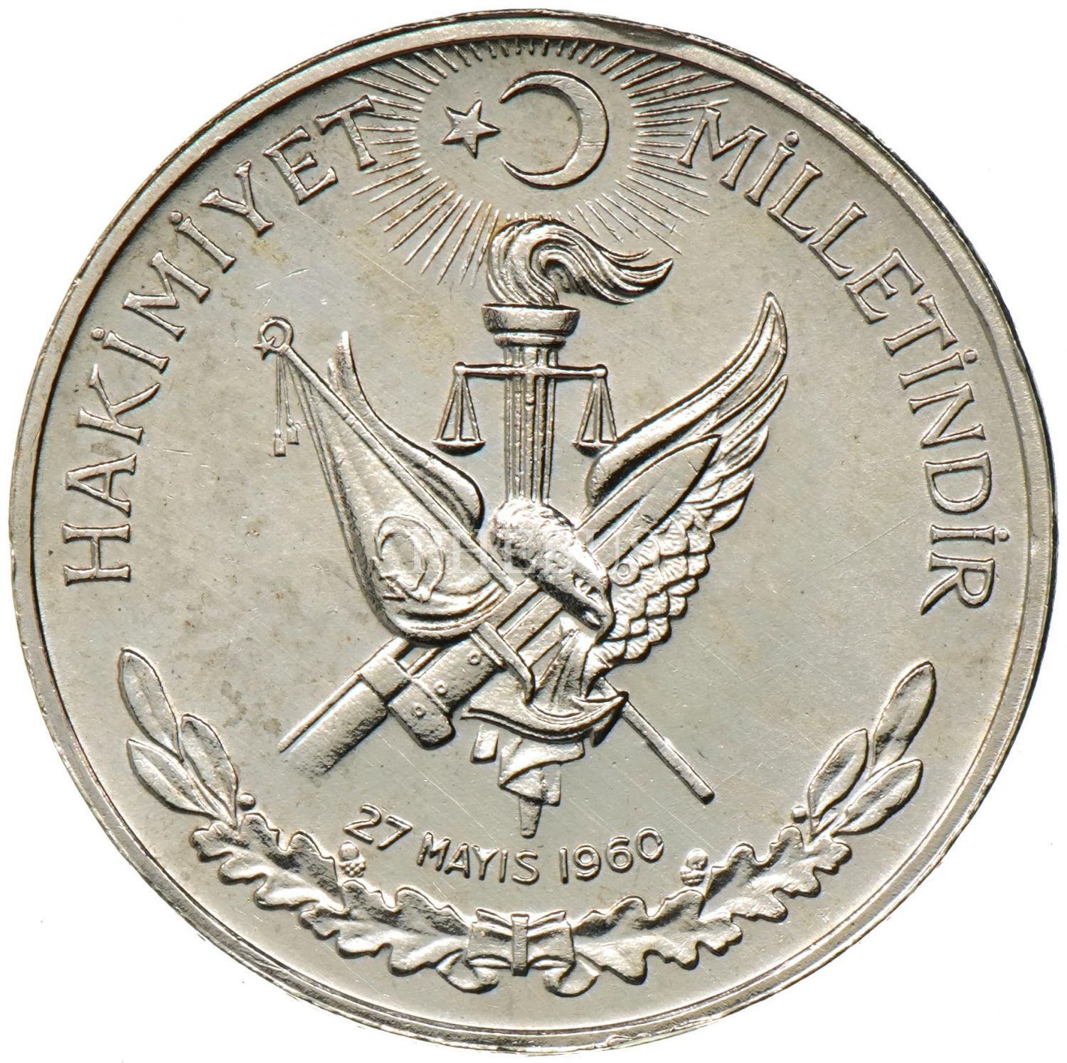 10 Lira 1960 Hakimiyet Milletindir 27 Mayıs 1960 - Kenar Yazısı Tura Yüzüne Göre TERS (34mm, 15gr 830 Ayar Gümüş) KM#894