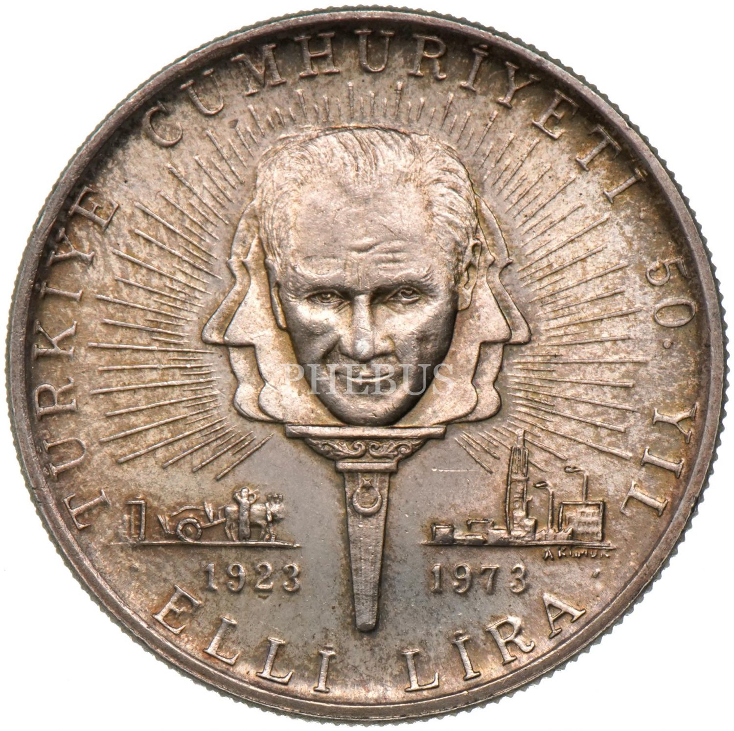 1973 Türkiye Cumhuriyeti´nin 50.Yılı 50 lira (13gr 900 ayar gümüş) TR#H011 - Zamanında Darphane tarafından sertifikasız olarak piyasaya verilmiştir