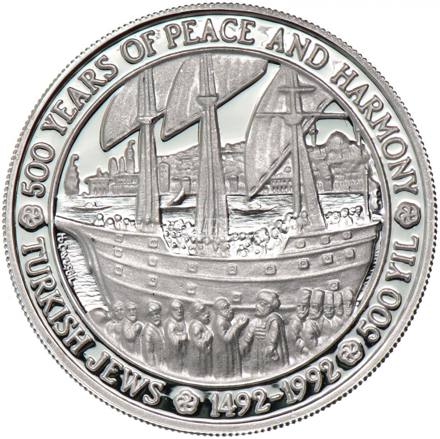 1992 Yahudilerin Göçünün 500. Yılı 50.000 Lira (23,33gr 925 ayar, proof gümüş) TR#H150 - Zamanında Darphane tarafından sertifikasız olarak piyasaya verilmiştir - Baskı adedi 2813