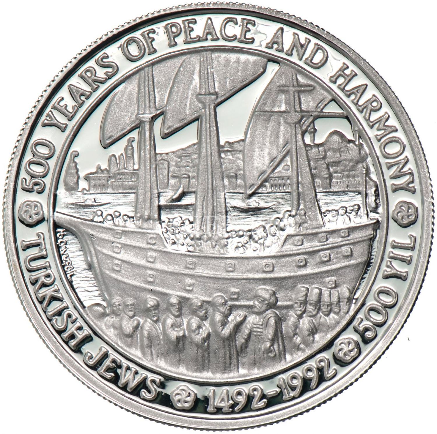 1992 Yahudilerin Göçünün 500. Yılı 50.000 Lira (23,33gr 925 ayar, proof gümüş) TR#H150 - Zamanında Darphane tarafından sertifikasız olarak piyasaya verilmiştir - Baskı adedi 2813