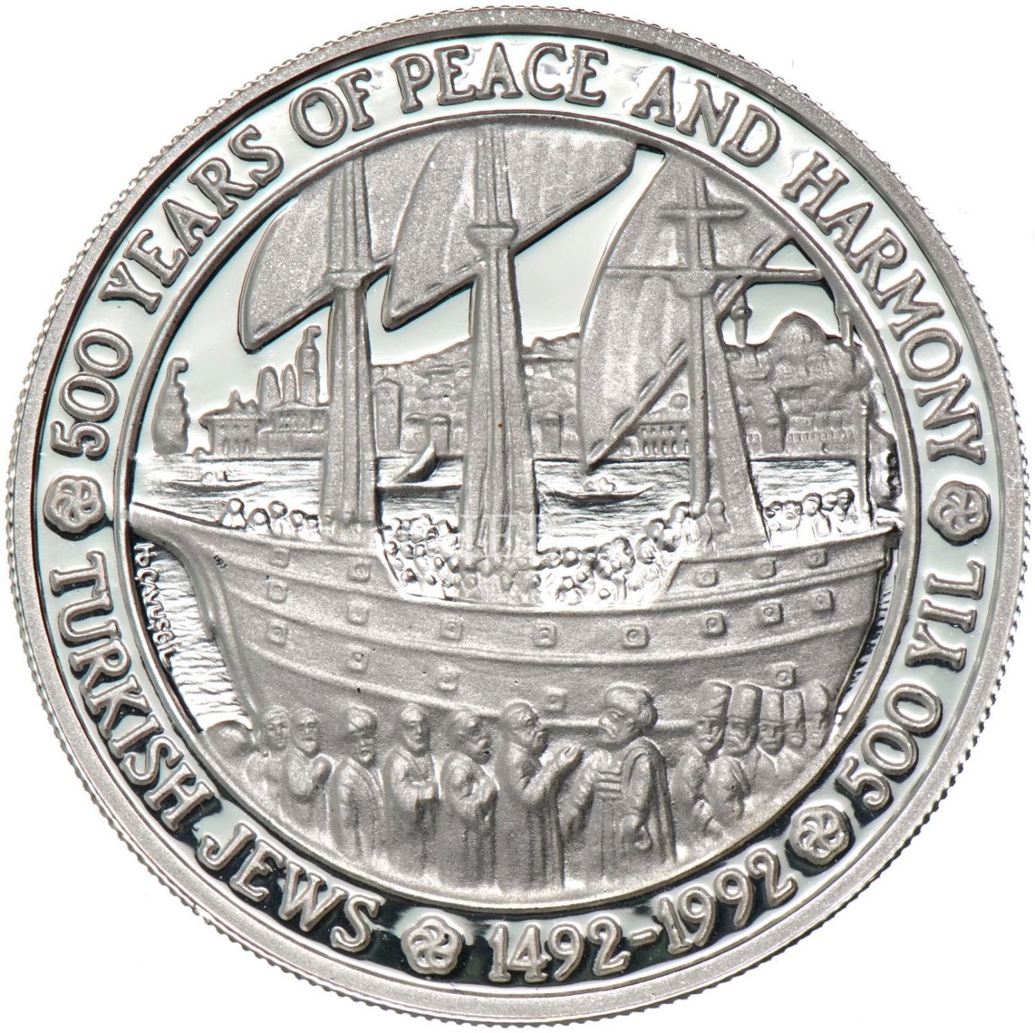 1992 Yahudilerin Göçünün 500. Yılı 50.000 Lira (23,33gr 925 ayar, proof gümüş) TR#H150 - Zamanında Darphane tarafından sertifikasız olarak piyasaya verilmiştir - Baskı adedi 2813